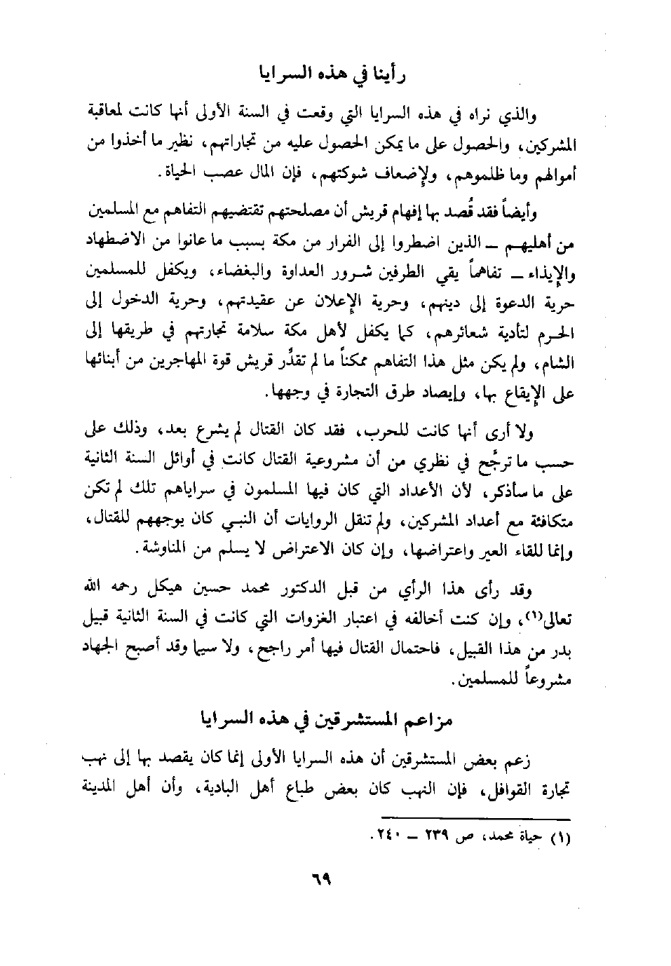 وقد رأى هذا الرأي من قبل الدكتور محمد حسين هيكل رحمه الله تعالى «1» ، وإن كنت أخالفه في اعتبار الغزوات التي كانت في السنة الثانية قبيل بدر من هذا القبيل، فاحتمال القتال فيها أمر راجح، ولا سيما وقد أصبح الجهاد مشروعا للمسلمين.