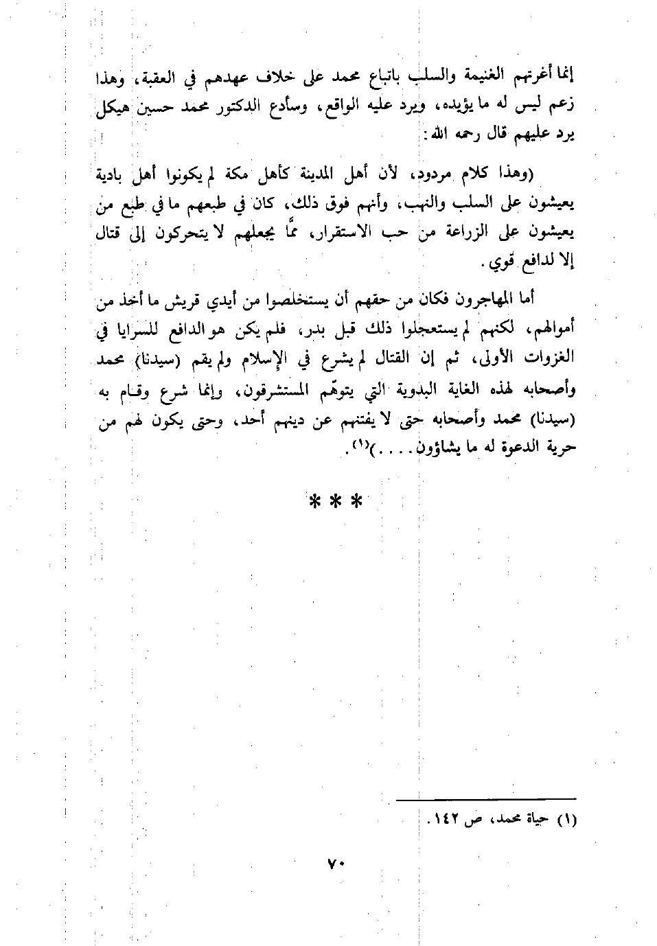أما المهاجرون فكان من حقهم أن يستخلصوا من أيدي قريش ما أخذ من أموالهم، لكنهم لم يستعجلوا ذلك قبل بدر، فلم يكن هو الدافع للسرايا في الغزوات الأولى، ثم إن القتال لم يشرع في الإسلام ولم يقم (سيدنا) محمد وأصحابه لهذه الغاية البدوية التي يتوهّم المستشرقون، وإنما شرع وقام به (سيدنا) محمد وأصحابه حتى لا يفتنهم عن دينهم أحد، وحتى يكون لهم من حرية الدعوة له ما يشاؤون....) «1» .