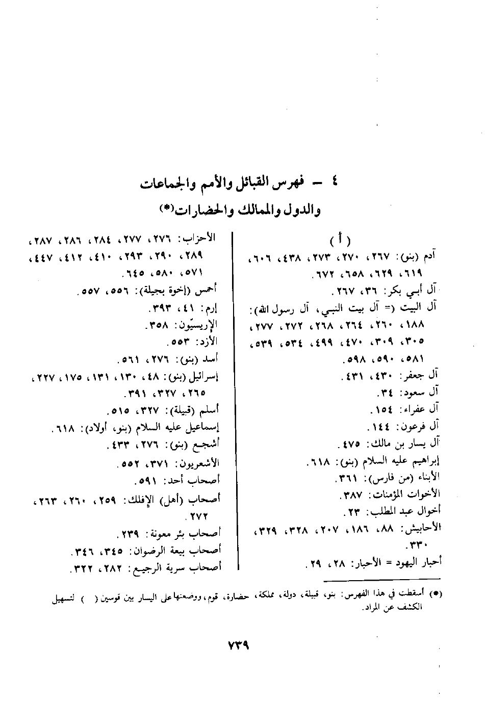 * أسقطت في هذا الفهرس: بنو، قبيلة، دولة، مملكة، حضارة، قوم، ووضعتها على اليسار بين قوسين () لتسهيل الكشف عن المراد.