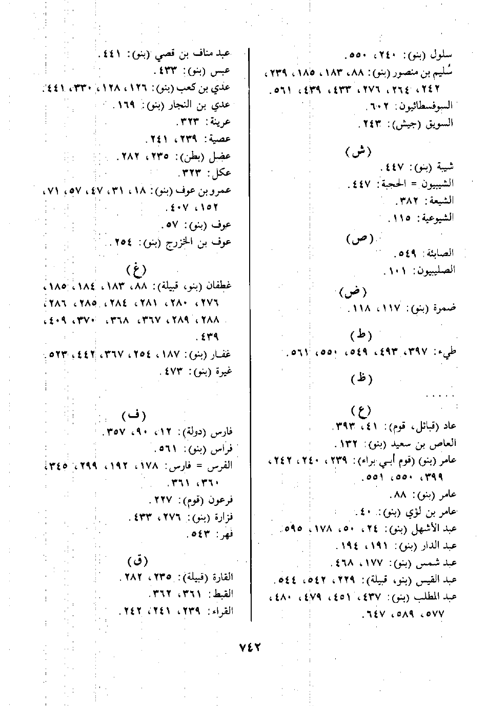 (غ) غطفان (بنو، قبيلة) : 88، 183، 184، 185، 276، 280، 281، 284، 285، 286، 288، 289، 367، 368، 370، 409، 439.