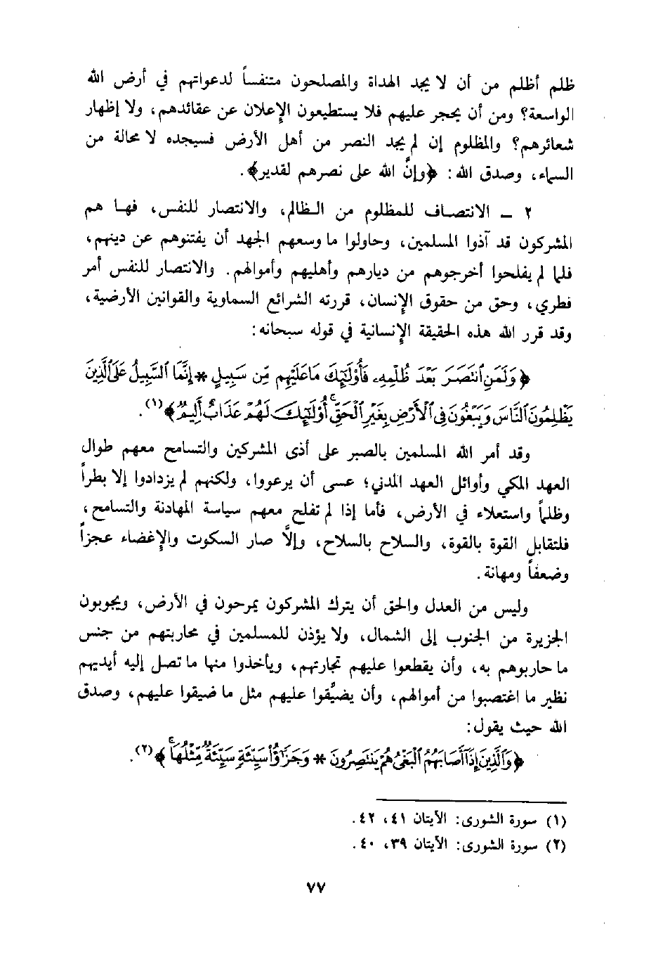وَلَمَنِ انْتَصَرَ بَعْدَ ظُلْمِهِ فَأُولئِكَ ما عَلَيْهِمْ مِنْ سَبِيلٍ. إِنَّمَا السَّبِيلُ عَلَى الَّذِينَ يَظْلِمُونَ النَّاسَ وَيَبْغُونَ فِي الْأَرْضِ بِغَيْرِ الْحَقِّ أُولئِكَ لَهُمْ عَذابٌ أَلِيمٌ «1» .