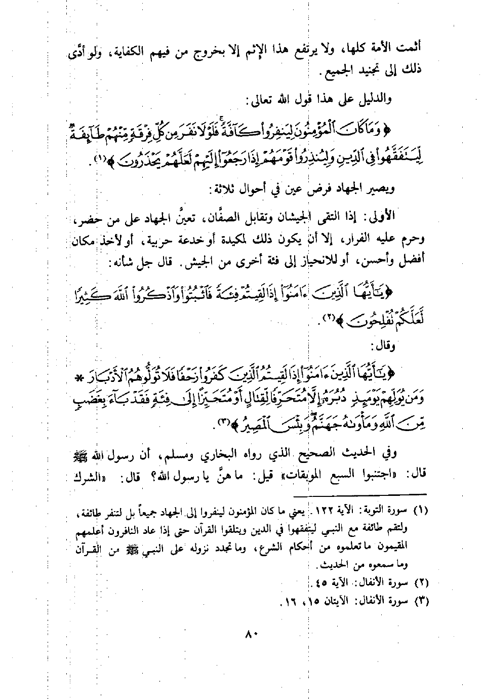 (1) سورة التوبة: الاية 122. يعني ما كان المؤمنون لينفروا إلى الجهاد جميعا بل لتنفر طائفة، ولتقم طائفة مع النبي ليتفقهوا في الدين ويتلقوا القران حتى إذا عاد النافرون أعلمهم المقيمون ما تعلموه من أحكام الشرع، وما تجدد نزوله على النبي صلى الله عليه وسلم من القران وما سمعوه من الحديث.