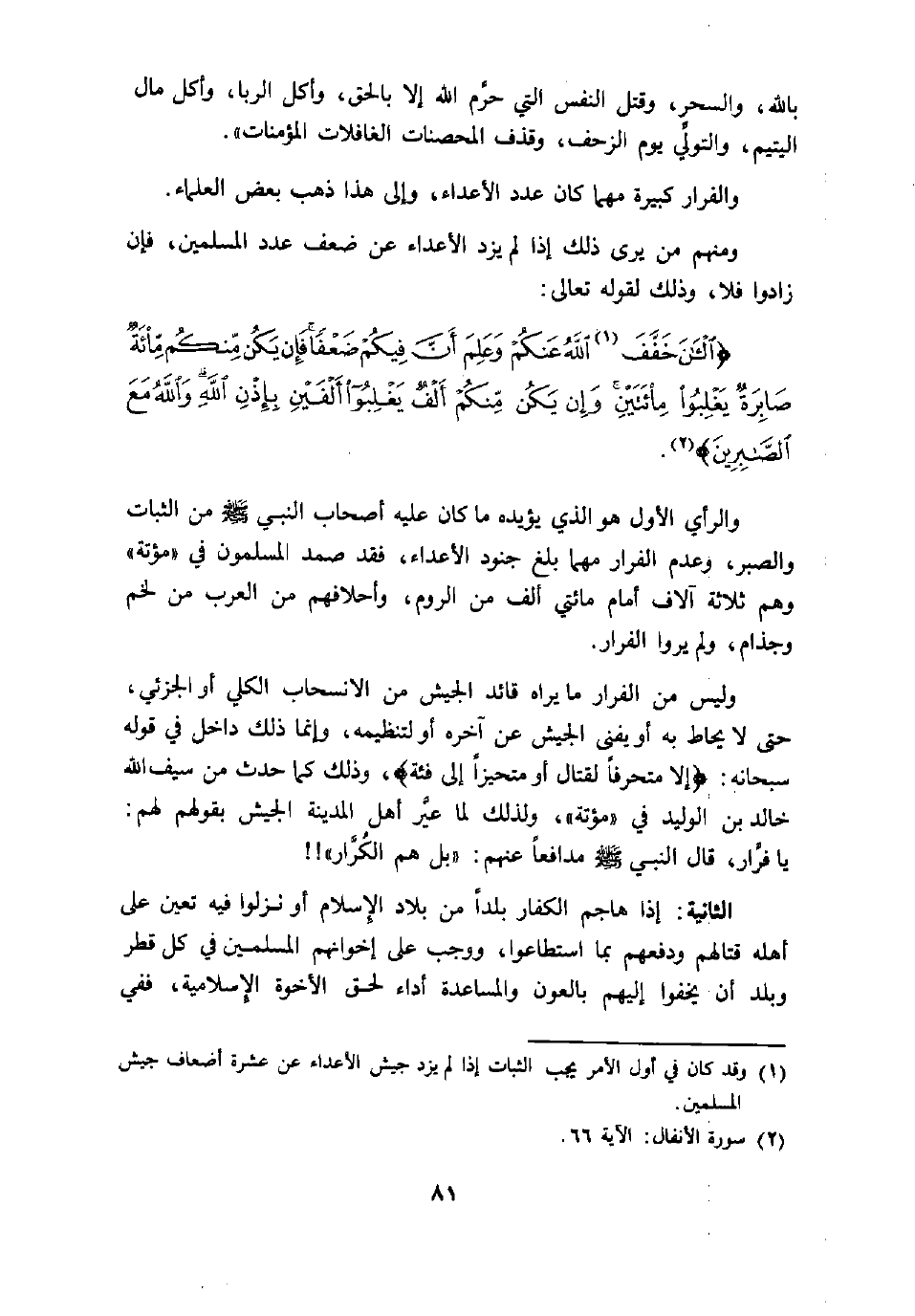 (1) وقد كان في أول الأمر يجب الثبات إذا لم يزد جيش الأعداء عن عشرة أضعاف جيش المسلمين.