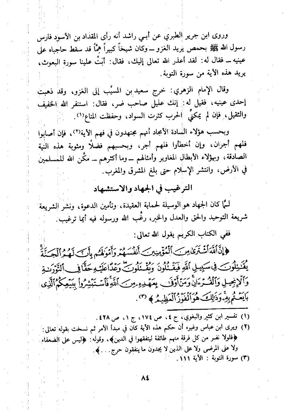 إِنَّ اللَّهَ اشْتَرى مِنَ الْمُؤْمِنِينَ أَنْفُسَهُمْ وَأَمْوالَهُمْ بِأَنَّ لَهُمُ الْجَنَّةَ يُقاتِلُونَ فِي سَبِيلِ اللَّهِ فَيَقْتُلُونَ وَيُقْتَلُونَ وَعْداً عَلَيْهِ حَقًّا فِي التَّوْراةِ وَالْإِنْجِيلِ وَالْقُرْآنِ وَمَنْ أَوْفى بِعَهْدِهِ مِنَ اللَّهِ فَاسْتَبْشِرُوا بِبَيْعِكُمُ الَّذِي بايَعْتُمْ بِهِ وَذلِكَ هُوَ الْفَوْزُ الْعَظِيمُ «3» .