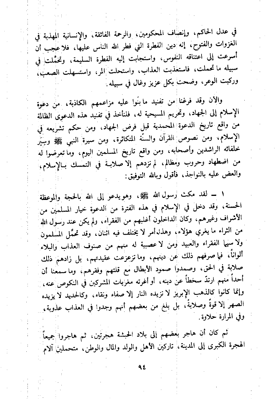 والان وقد فرغنا من تفنيد ما بنوا عليه مزاعمهم الكاذبة، من دعوة الإسلام إلى الجهاد، وتحريم المسيحية له، فلنأخذ في تفنيد هذه الدعوى الظالمة من واقع تاريخ الدعوة المحمدية قبل فرض الجهاد، ومن حكم تشريعه في الإسلام، ومن نصوص القران والسنّة المتكاثرة، ومن سيرة النبي صلى الله عليه وسلم وسير خلفائه الراشدين وأصحابه، ومن واقع تاريخ المسلمين اليوم، وما تعرضوا له من اضطهاد وحروب ومظالم، لم تزدهم إلا صلابة في التمسك بالإسلام، والعض عليه بالنواجذ، فأقول وبالله التوفيق: