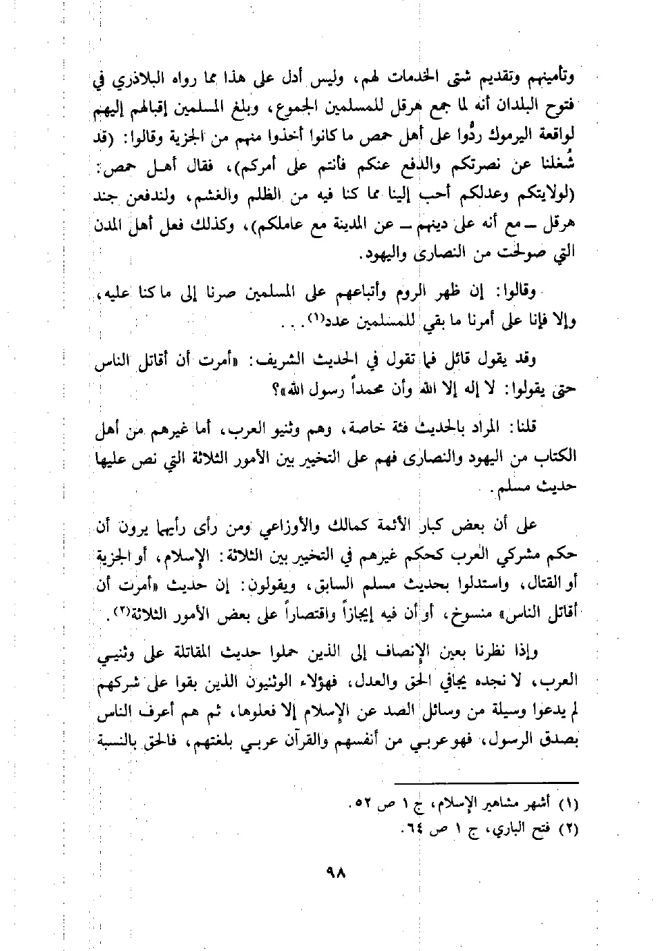 على أن بعض كبار الأئمة كمالك والأوزاعي ومن رأى رأيهما يرون أن حكم مشركي العرب كحكم غيرهم في التخيير بين الثلاثة: الإسلام، أو الجزية أو القتال، واستدلوا بحديث مسلم السابق، ويقولون: إن حديث «أمرت أن أقاتل الناس» منسوخ، أو أن فيه إيجازا واقتصارا على بعض الأمور الثلاثة «2» .