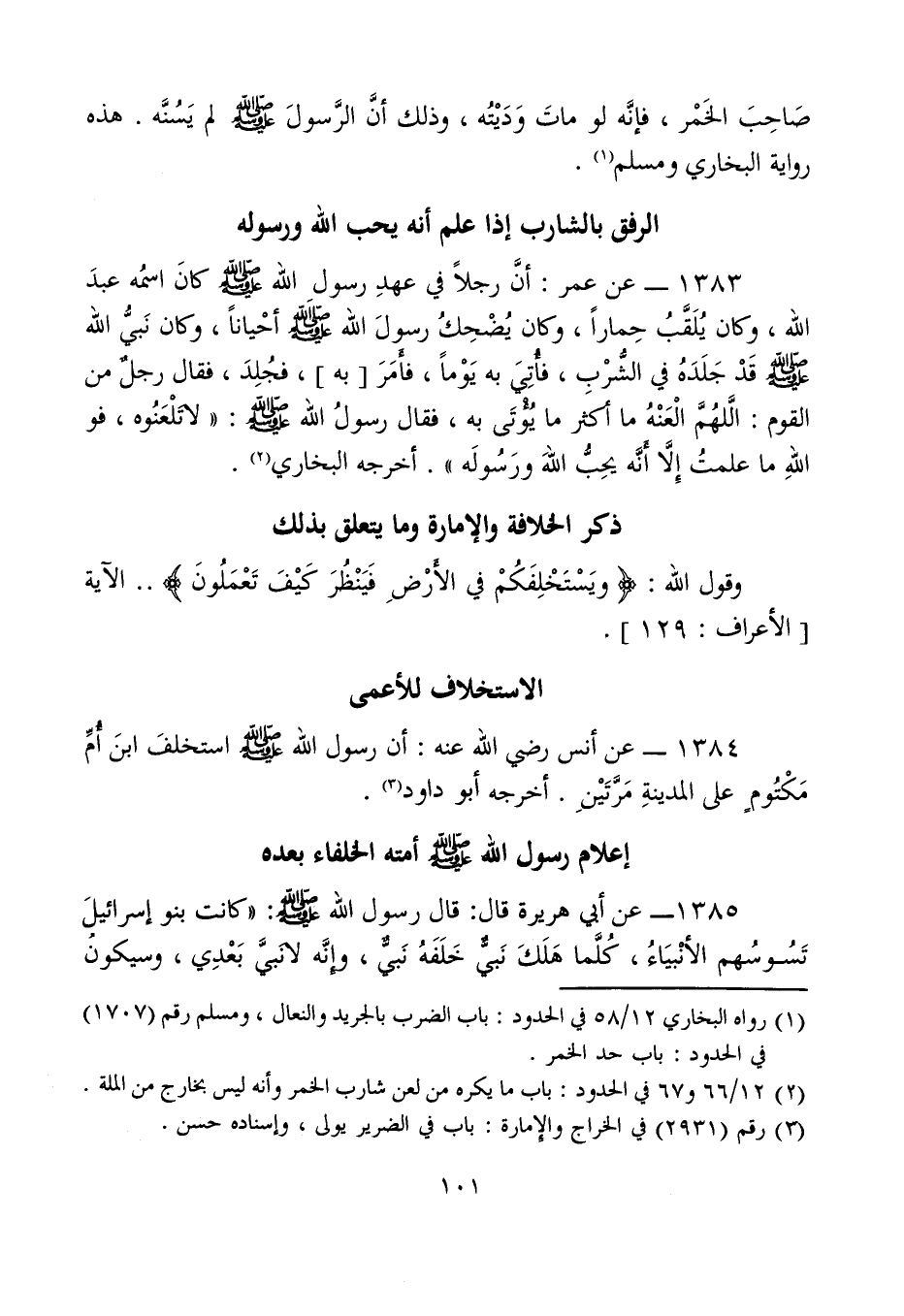 1383 - عن عمر: أنَّ رجلًا في عهدِ رسول الله - صلى الله عليه وسلم - كانَ اسمهُ عبدَ الله، وكان يُلَقَّبُ حِمارًا، وكان يُضْحِكُ رسولَ الله - صلى الله عليه وسلم - أحْيانًا، وكان نبَيُّ الله - صلى الله عليه وسلم - قَدْ جَلَدَهُ في الشُّرْب، فأُتِيَ به يَوْمًا, فأَمَرَ [به]، فجُلِدَ، فقال رجلٌ من القوم: الَّلهُمَّ الْعَنْهُ ما أكثر ما يُؤْتَى به، فقال رسولُ الله - صلى الله عليه وسلم -: "لا تَلْعَنُوه، فو اللهِ ما علمتُ إِلَّا أَنَّه يحِبُّ اللهَ ورَسُولَه". أخرجه البخاري (¬2).