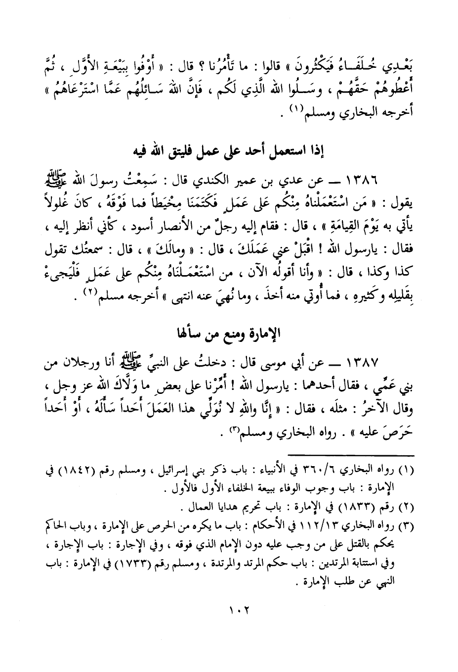 (¬3) رواه البخاري 13/ 112 في الأحكام: باب ما يكره من الحرص على الإمارة، وباب الحاكم يحكم بالقتل على من وجب عليه دون الإمام الذي فوقه، وفي الإجارة: باب الإِجارة، وفي استتابة المرتدين: باب حكم المرتد والمرتدة، ومسلم رقم (1733) في الإمارة: باب النهي عن طلب الإمارة.