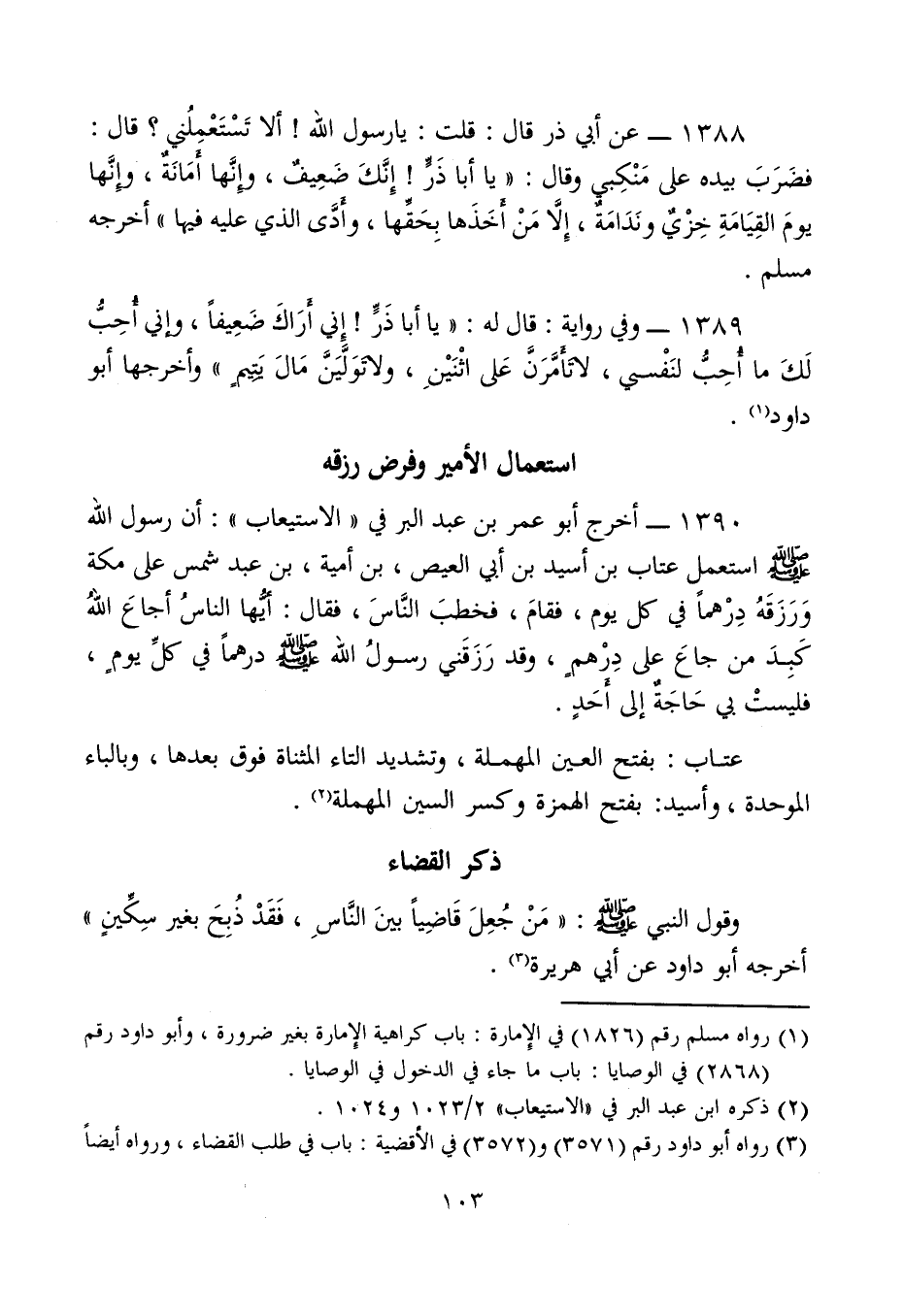 1388 - عن أبي ذر قال: قلت: يا رسول الله! ألا تَسْتَعْمِلُني؟ قال: فضَرَبَ بيده على مَنْكِبي وقال: "يا أبا ذَرٍّ! إِنَّكَ ضَعِيفٌ، وإِنَّها أمَانَةٌ، وإِنَّها يومَ القِيَامَةِ خِزْيٌ ونَدَامَةٌ، إلَّا مَنْ أَخَذَها بِحَقِّها، وأَدَّى الذي عليه فيها" أخرجه مسلم.