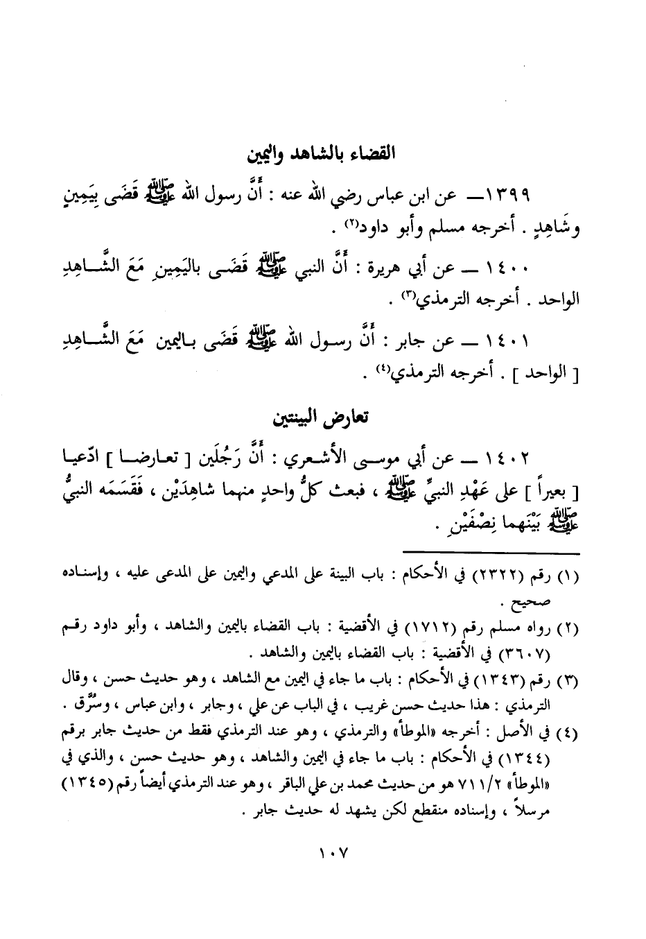 1400 - عن أبي هريرة: أَنَّ النبي - صلى الله عليه وسلم - قَضَى باليَمِينِ مَعَ الشَّاهِدِ الواحد. أخرجه الترمذي (¬2).