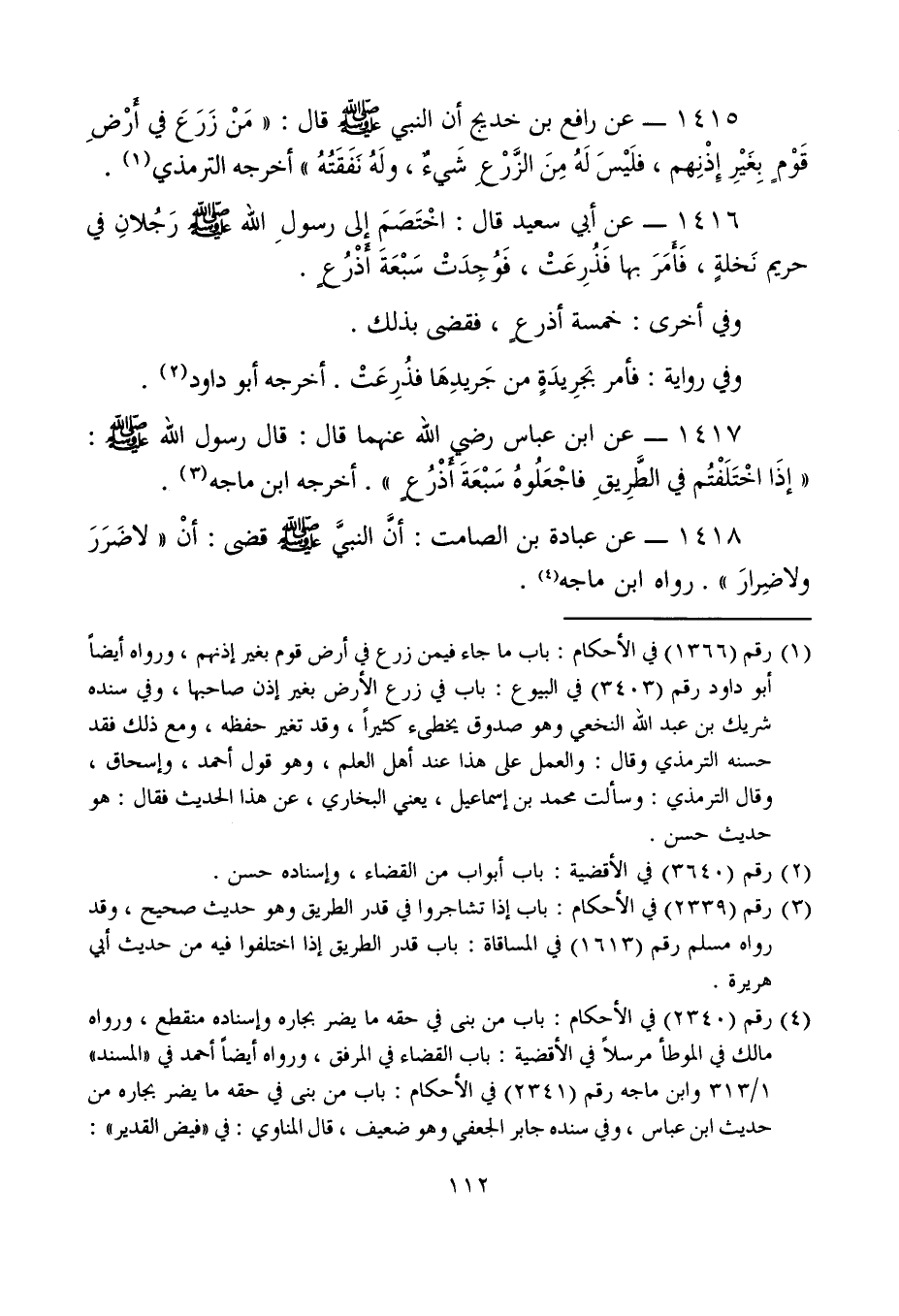 1418 - عن عبادة بن الصامت: أنَّ النبيَّ - صلى الله عليه وسلم - قضى: أنْ "لا ضَرَرَ ولا ضِرارَ". رواه ابن ماجه (¬4).