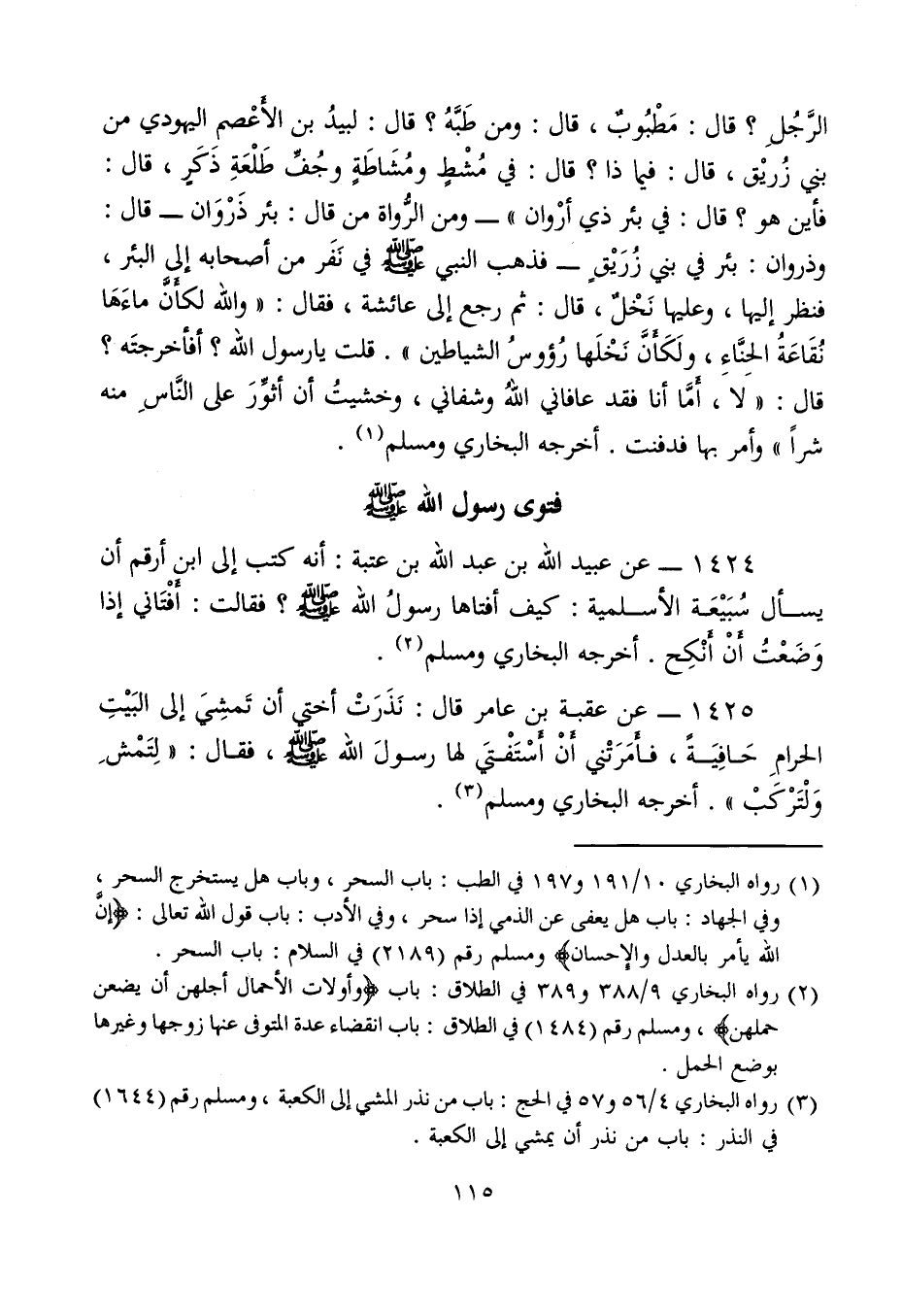 1424 - عن عبيد الله بن عبد الله بن عتبة: أنه كتب إلى ابن أرقم أن يسأل سُبَيْعَة الأسلمية: كيف أفتاها رسولُ الله - صلى الله عليه وسلم -؟ فقالت: أَفْتَاني إذا وَضَعْتُ أَنْ أَنْكِح. أخرجه البخاري ومسلم (¬2).