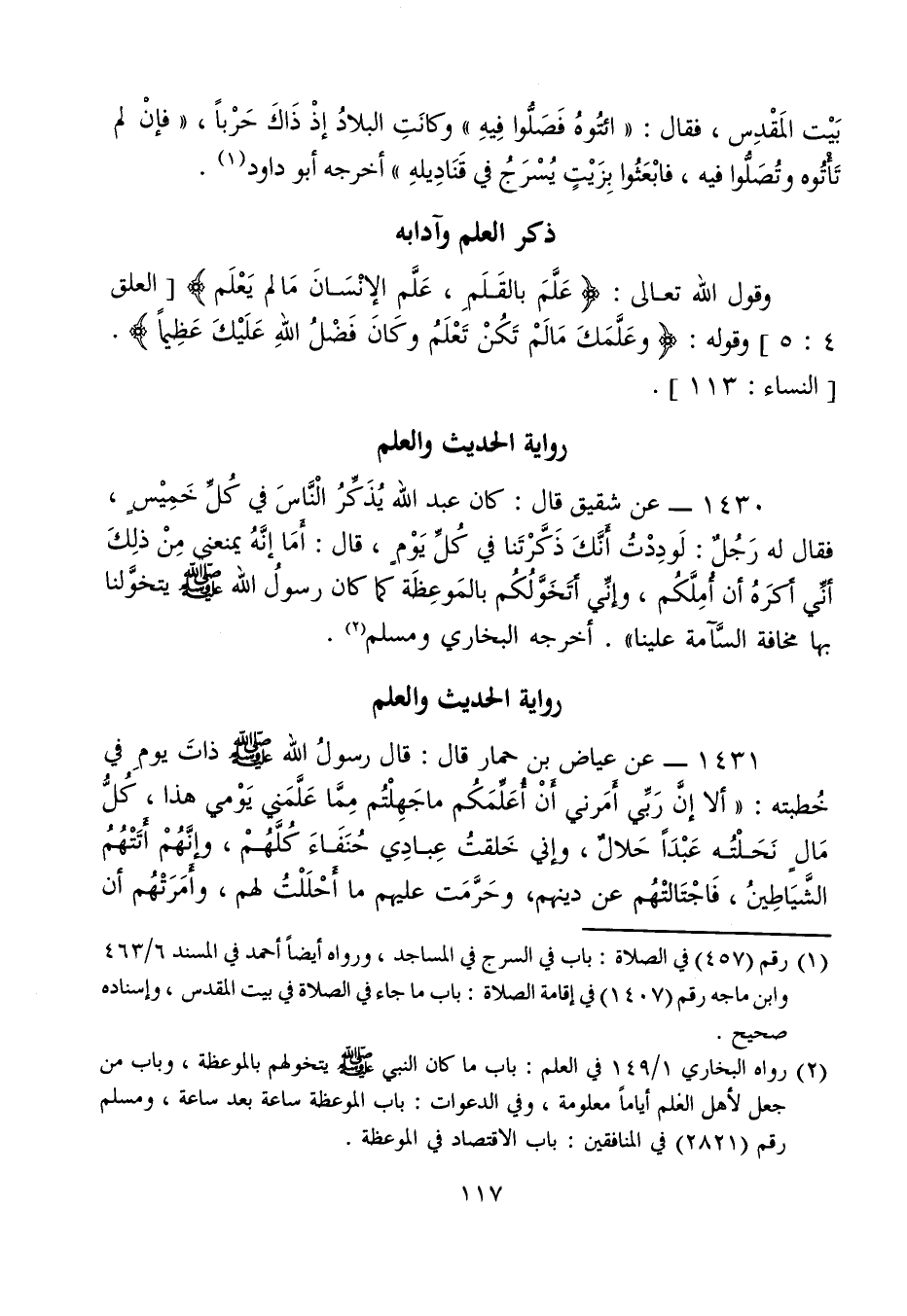 1430 - عن شقيق قال: كان عبد الله يُذَكِّرُ الْنَّاسَ في كُلِّ خَمِيْسٍ، فقال له رَجُلٌ: لَودِدْتُ أَنَّكَ ذَكَّرْتَنا في كُلِّ يَوْمٍ، قال: أَمَا إنَّهُ يمنعني مِنْ ذلِكَ أنِّي أكرَهُ أن أُمِلَّكُم، وإنِّي أتَخَوَّلُكُم بالمَوعِظَة كما كان رسولُ الله - صلى الله عليه وسلم - يتخوَّلنا بها مخافة السَّآمة علينا". أخرجه البخاري ومسلم (¬2).