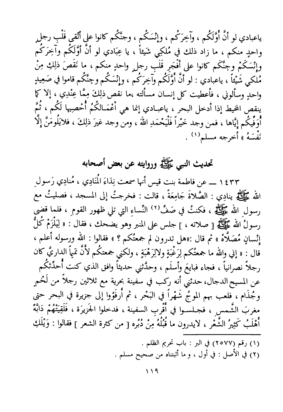 1433 - عن فاطمة بنت قيس أنها سمعت نِدَاءَ المُنَادِي، مُنادِي رَسولِ الله - صلى الله عليه وسلم - ينادِي: الصَّلاةَ جَامِعَةً، قالت: فخرجتُ إلى المسجد، فصليتُ مع رسولِ الله - صلى الله عليه وسلم -، فكنتُ في صَفِّ (¬2) النِّساءِ التي تلي ظهور القومِ، فلما قضى رسولُ الله- صلى الله عليه وسلم -[صلاته]، جلس على المنبر وهو يضحك، فقال: "لِيَلْزَمْ كُلُّ إِنْسانٍ مُصلَّاهُ" ثم قال: "هل تدرون لم جمعتُكم؟ " فقالوا: الله ورسوله أعلم، قال: "إني والله ما جمعتُكم لِرَغْبَةٍ ولا لِرَهْبَةٍ، ولكني جمعتكُم لأَنَّ تميمًا الداريَّ كان رجلًا نصرانيًا، فجاء فبايعَ وأسلَم، وحدَّثني حديثًا وافق الذي كنت أُحدِّثكُم عن المسيح الدجال، حدثني أنه ركب في سفينة بحرية مع ثلاثين رجلًا من لَخْمٍ وجُذَام، فلعب بهم الموجُ شَهْرًا في البَحْر، ثم أَرفَؤوا إلى جزيرة في البحر حتى مغربَ الشَّمسِ، فجلسوا في أَقْربِ السفينة، فدخلوا الجَزيرَة، فَلَقِيَتْهُمْ دَابَّةٌ أَهْلَبُ كَثِيرُ الشَّعْر، لا يدرون ما قُبُلُهُ مِنْ دُبُره [من كثرة الشعر] فقالوا: وَيْلَكِ