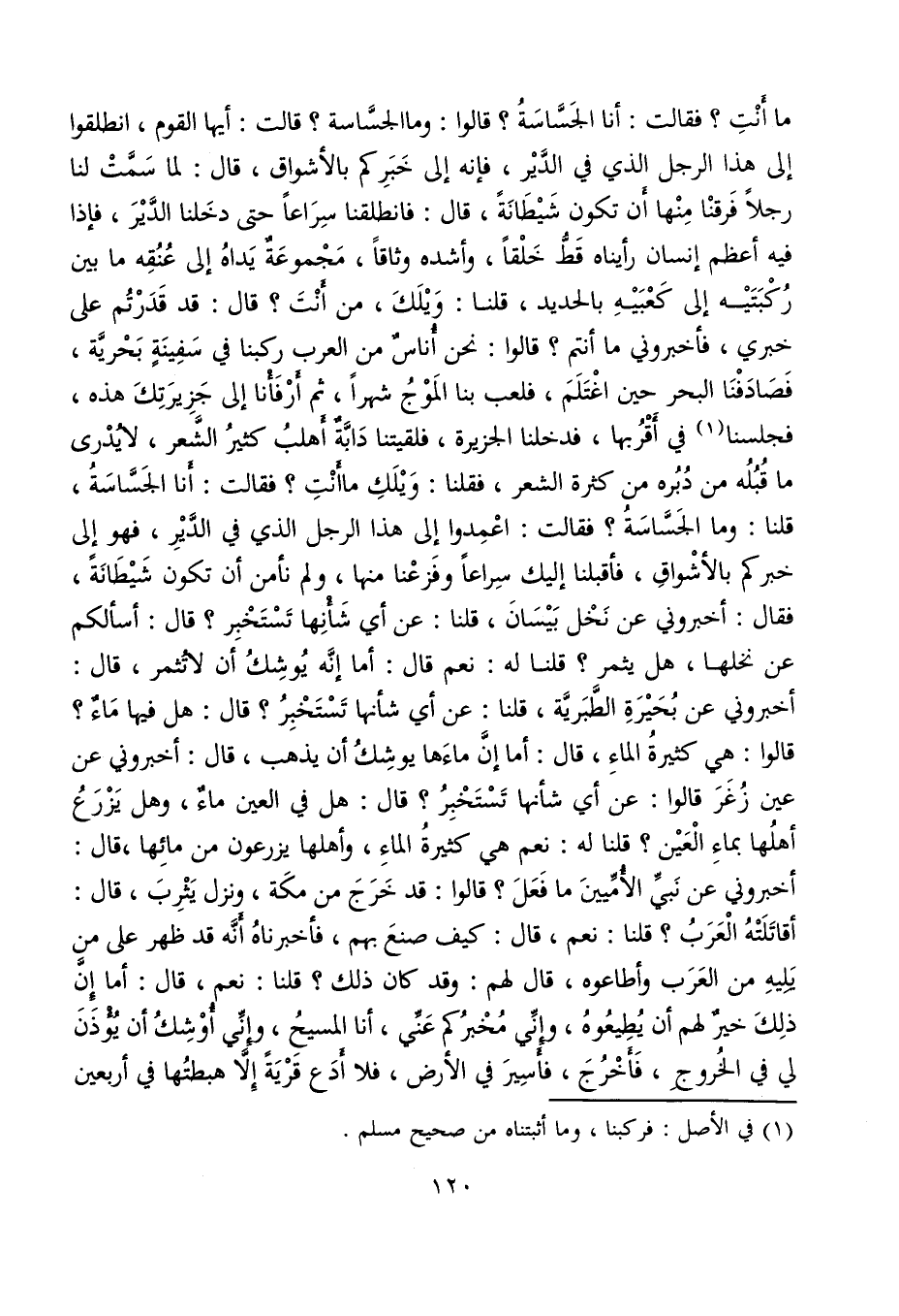 ما أَنْتِ؟ فقالت: أنا الجَسَّاسَةُ؟ قالوا: وما الجسَّاسة؟ قالت: أيها القوم، انطلقوا إلى هذا الرجل الذي في الدَّيْر، فإنه إلى خَبَرِكم بالأشواق، قال: لما سَمَّتْ لنا رجلًا فَرقنْا مِنْها أَن تكون شَيْطَانَةً، قال: فانطلقنا سِرَاعًا حتى دخَلنا الدَّيْرَ، فإذا فيه أعظم إنسان رأيناه قَطُّ خَلْقًا، وأشده وثاقًا، مَجْموعَةٌ يَداهُ إلى عُنُقِه ما بين رُكْبَتَيْه إلى كَعْبَيْهِ بالحديد، قلنا: وَيْلَكَ، من أنْتَ؟ قال: قد قَدَرْتُم على خبري، فأخبروني ما أنتم؟ قالوا: نحن أُناسٌ من العرب ركبنا في سَفِينَةٍ بَحْريَّة، فَصَادَفْنَا البحر حين اغْتَلَمَ، فلعب بنا المَوْجُ شهرًا، ثم أَرْفَأْنا إلى جَزِيرَتِكَ هذه، فجلسنا (¬1) في أَقْرُبها، فدخلنا الجزيرة، فلقيتنا دَابَّة أهلبُ كثيرُ الشَّعر، لا يُدْرى ما قُبُلُه من دُبُره من كثرة الشعر، فقلنا: وَيْلَكِ ما أَنْتِ؟ فقالت: أَنا الجَسَّاسَةُ، قلنا: وما الجَسَّاسَةُ؟ فقالت: اعْمِدوا إِلى هذا الرجل الذي في الدَّيْرِ، فهو إلى خبركم بالأشْواقِ، فأقبلنا إليك سِراعًا وفَزعْنا منها، ولم نأمن أن تكون شَيْطَانَةً، فقال: أخبروني عن نَخْل بَيْسَانَ، قلنا: عن أي شَأْنِها تَسْتَخْبِر؟ قال: أسألكم عن نخلها، هل يثمر؟ قلنا له: نعم قال: أما إنَّه يُوشِكُ أن لا تُثمر، قال: أخبروني عن بُحَيْرَةِ الطَّبَريَّة، قلنا: عن أي شأنها تَسْتَخْبِرُ؟ قال: هل فيها مَاءٌ؟ قالوا: هي كثيرةُ الماءِ، قال: أما إنَّ ماءَها يوشِكُ أن يذهب، قال: أخبروني عن عين زُغَرَ قالوا: عن أي شأنها تَسْتَخْبِرُ؟ قال: هل في العين ماءٌ، وهل يَزْرَعُ أهلُها بماءِ الْعَيْن؟ قلنا له: نعم هي كثيرةُ الماءِ، وأهلها يزرعون من مائِها، قال: أخبروني عن نَبيِّ الأُمِّيينَ ما فَعَلَ؟ قالوا: قد خَرَجَ من مكَة، ونزل يَثْرِبَ، قال: أقاتَلَتْهُ الْعَرَبُ؟ قلنا: نعم، قال: كيف صنعَ بهم، فأخبرناهُ أَنَّه قد ظهر على من يَلِيهِ من العَرَب وأطاعوه، قال لهم: وقد كان ذلك؟ قلنا: نعم، قال: أما إِنَّ ذلِكَ خيرٌ لهم أن يُطِيعُوهُ، وإنِّي مُخْبرُكم عَنِّي، أنا المسيحُ، وإنِّي أُوْشِكُ أن يُؤْذَنَ لي في الخُروجِ، فَأَخْرُجَ، فأَسِيرَ في الأرض، فلا أَدَع قَرْيَةً إِلَّا هبطتُها في أربعين