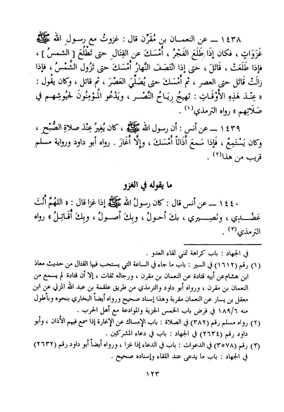 1438 - عن النعمان بن مُقَرِّن قال: غزوتُ مع رسولِ الله - صلى الله عليه وسلم - غَزَوَاتٍ، فكان إذَا طَلَعَ الفَجْرُ، أمْسَكَ عن القِتَالِ حتى تَطْلُعَ [الشمسُ]، فإذا طَلَعَتْ، قَاتَلَ، حتى إذا انْتَصَفَ النَّهارُ أَمْسَكَ حتى تَزُول الشَّمْسُ، فإذا زالَتْ قَاتَل حتى العصر، ثم أَمْسَكَ حتى يُصَلِّيَ العَصْرَ، ثم قاتل، وكان يقُول: "عِنْدَ هَذِهِ الأَوْقَاتِ: تَهيجُ رِيَاحُ النَّصْر، ويَدْعُو المُؤمِنُونَ لجيُوشِهم في صَلَاتِهم" رواه الترمذي (¬1).