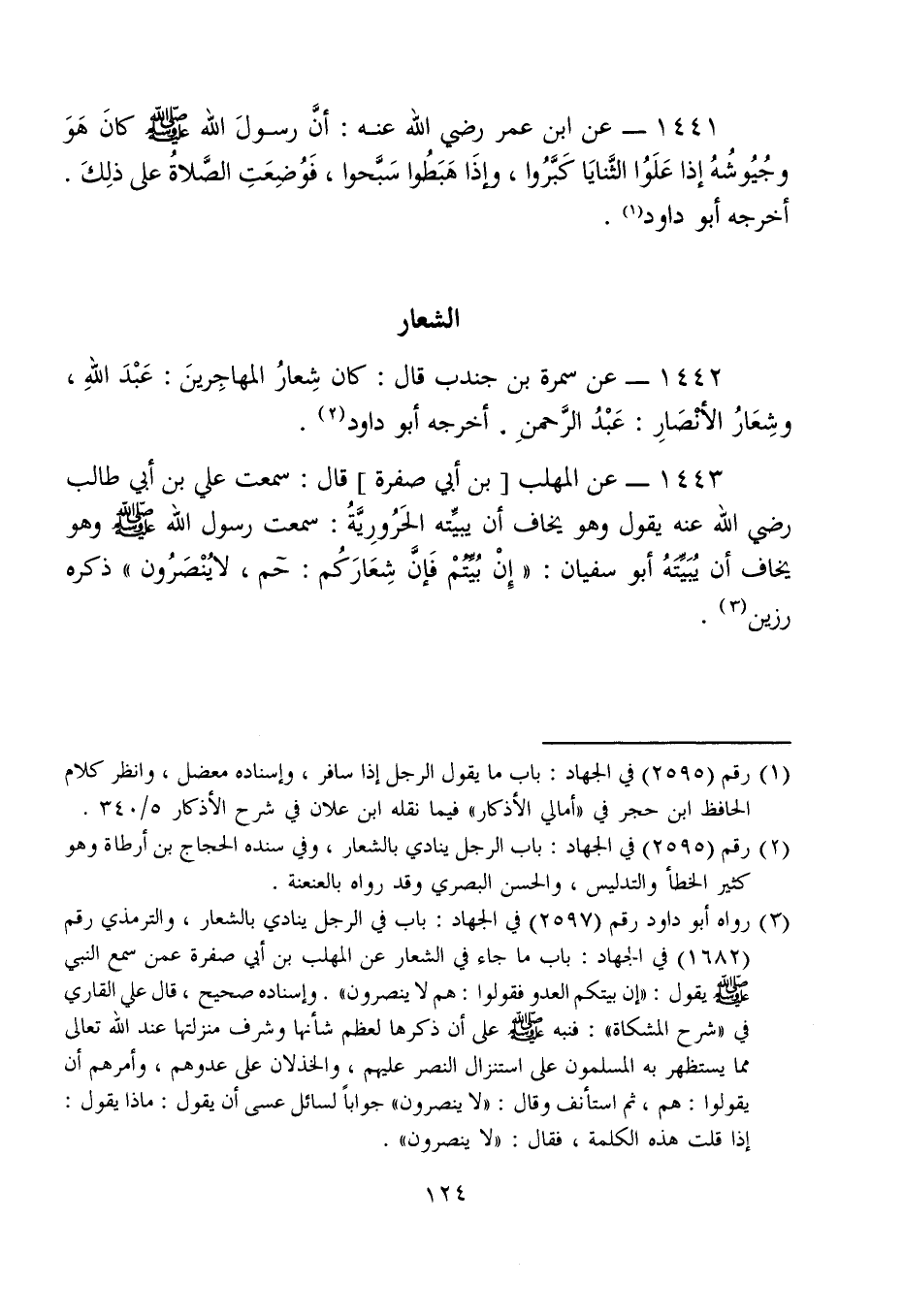 1441 - عن ابن عمر رضي الله عنه: أنَّ رسولَ الله - صلى الله عليه وسلم - كانَ هَوَ وجُيُوشُهُ إذا عَلَوُا الثَّنايَا كَبَّرُوا، وإذَا هَبَطُوا سَبَّحوا، فَوُضِعَتِ الصَّلاةُ على ذلِكَ. أخرجه أبو داود (¬1).