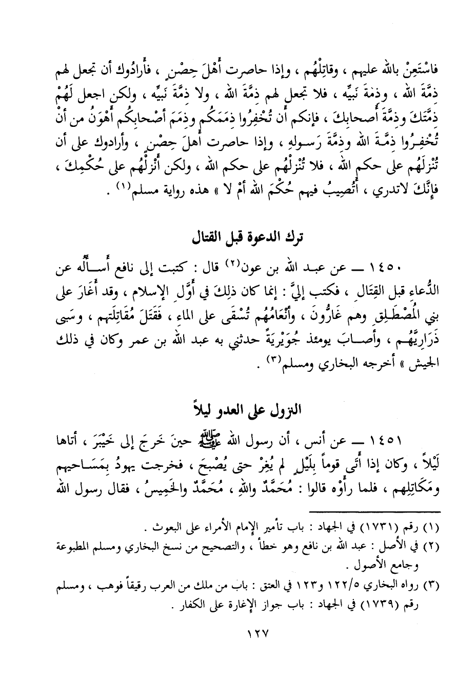 1450 - عن عبد الله بن عون (¬2) قال: كتبت إلى نافع أَسأَلُه عن الدُّعاءِ قبل القِتَالِ، فكتب إليَّ: إنما كان ذلِكَ في أَوَّلِ الإسلام، وقد أَغَارَ على بني المُصْطَلِقِ وهم غَارُّونَ، وأنْعَامُهُم تُسْقَى على الماءِ، فَقَتَلَ مُقَاتِلَتهم، وسَبى ذَرَارِيَّهُم، وأصابَ يومئذ جُوَيْريَةً حدثني به عبد الله بن عمر وكان في ذلك الجيش" أخرجه البخاري ومسلم (¬3).