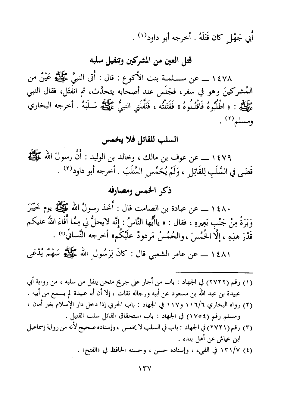 1479 - عن عوف بن مالك، وخالد بن الوليد: أَنَّ رسولَ الله - صلى الله عليه وسلم - قَضى في السَّلَبِ لِلقَاتِلِ، وَلَمْ يُخَمِّسِ السَّلَبَ. أخرجه أبو داود (¬3).