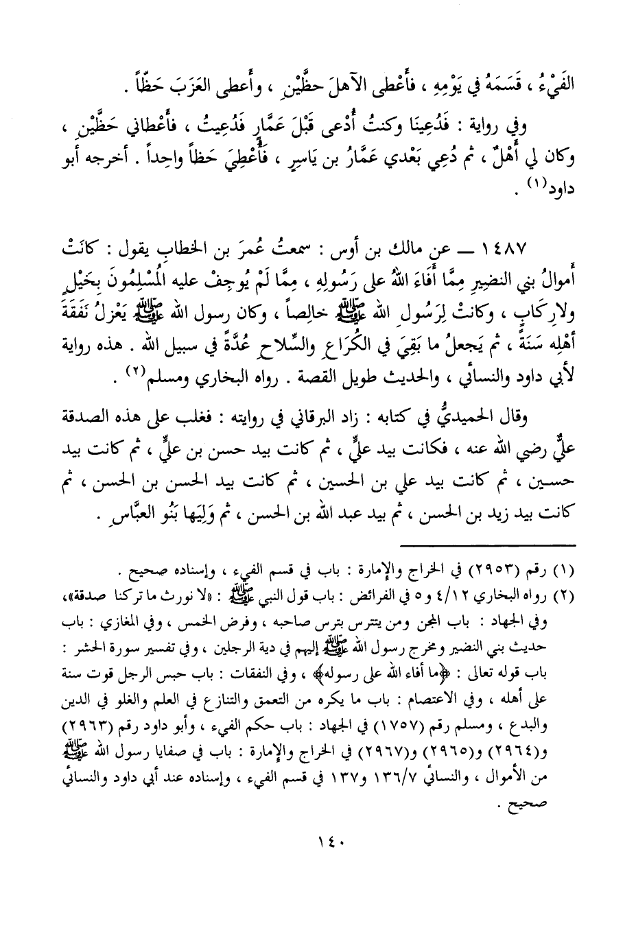 1487 - في مالك بن أوس: سمعتُ عُمرَ بن الخطابِ يقول: كانَتْ أَموالُ بني النضِيرِ مِمَّا أَفَاءَ اللهُ على رَسُولِهِ، مِمَّا لَمْ يُوجِفْ عليه المُسْلِمُونَ بِخَيْلٍ ولا رِكَابٍ، وكانتْ لِرَسُولِ الله - صلى الله عليه وسلم - خالِصًا، وكان رسول الله - صلى الله عليه وسلم - يَعْزلُ نَفَقَةَ أهْلِه سَنَةً، ثم يَجعلُ ما بَقِيَ في الكُرَاعِ والسِّلاحِ عُدَّةً في سبيل الله. هذه رواية لأبي داود والنسائي، والحديث طويل القصة. رواه البخاري ومسلم (¬2).