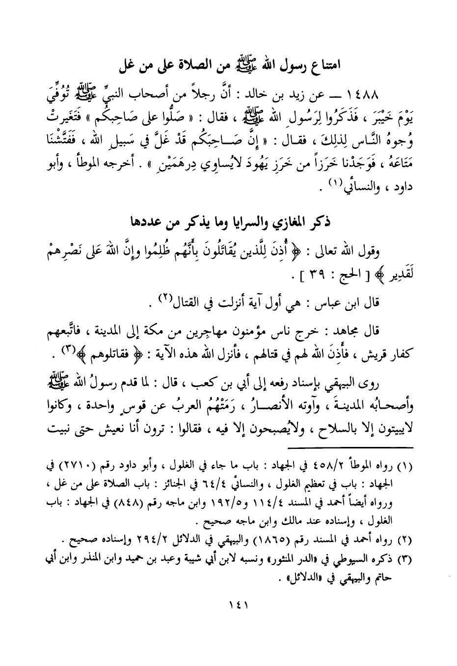 1488 - عن زيد بن خالد: أنَّ رجلًا من أصحاب النبيِّ - صلى الله عليه وسلم - تُوُفِّيَ يَوْمَ خَيْبَرَ، فَذَكَرُوا لِرَسُولِ الله - صلى الله عليه وسلم -، فقال: "صَلُّوا على صَاحِبكُم" فَتَغَيرتْ وُجوهُ النَّاس لِذلِكَ، فقال: "إِنَّ صَاحِبَكُم قَدْ غَلَّ في سَبيلِ الله، فَفَتَّشْنَا مَتَاعَهُ، فَوَجَدْنا خَرَزًا من خَرَزِ يَهُودَ لا يُساوِي دِرهَمَيْنِ". أخرجه الموطأ، وأبو داود، والنسائي (¬1).