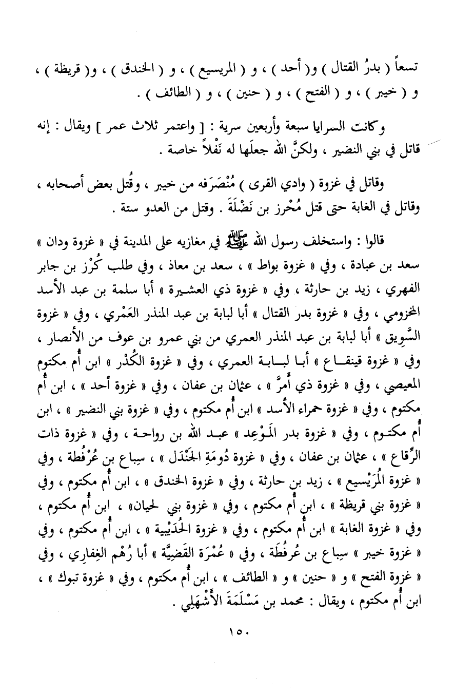 وكانت السرايا سبعة وأربعين سرية: [واعتمر ثلاث عمر] ويقال: إنه قاتل في بني النضير، ولكنَّ الله جعلَها له نَفْلًا خاصة.