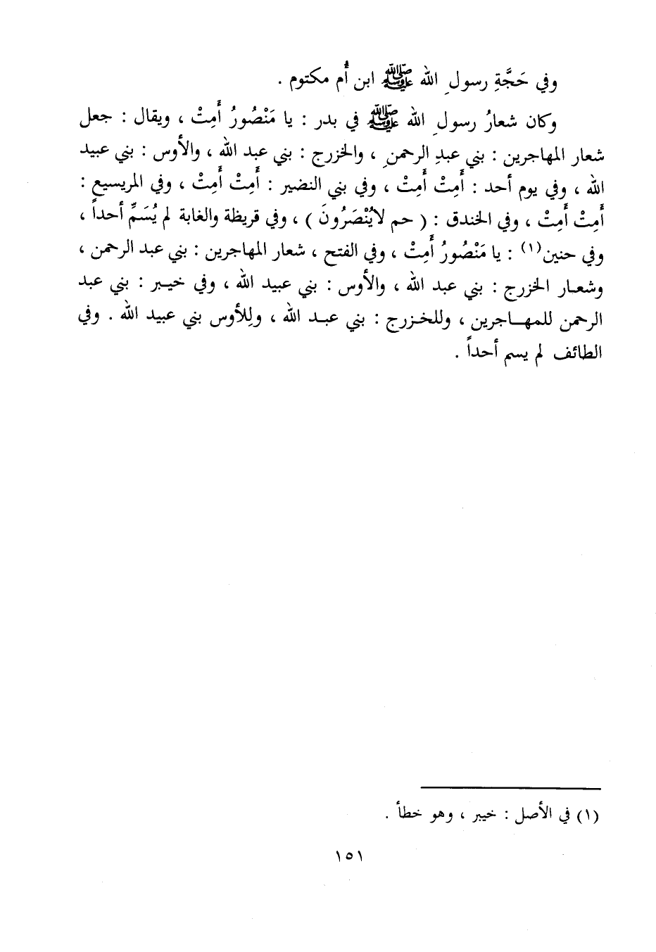 وكان شعارُ رسولِ الله - صلى الله عليه وسلم - في بدر: يا مَنْصُورُ أَمِتْ، ويقال: جعل شعار المهاجرين: بني عبدِ الرحمنِ، والخزرج: بني عبد الله، والأوس: بني عبيد الله، وفي يوم أحد: أَمِتْ أَمِتْ، وفي بني النضير: أَمِتْ أَمِتْ، وفي المريسيع: أَمِتْ أَمِتْ، وفي الخندق: (حم لا يُنْصَرُونَ)، وفي قريظة والغابة لم يُسَمِّ أحدًا، وفي حنين (¬1): يا مَنْصُورُ أَمِتْ، وفي الفتح، شعار المهاجرين: بني عبد الرحمن، وشعار الخزرج: بني عبد الله، والأوس: بني عبيد الله، وفي خيبر: بني عبد الرحمن للمهاجرين، وللخزرج: بني عبد الله، ولِلأوس بني عبيد الله. وفي الطائف لم يسم أحدًا.