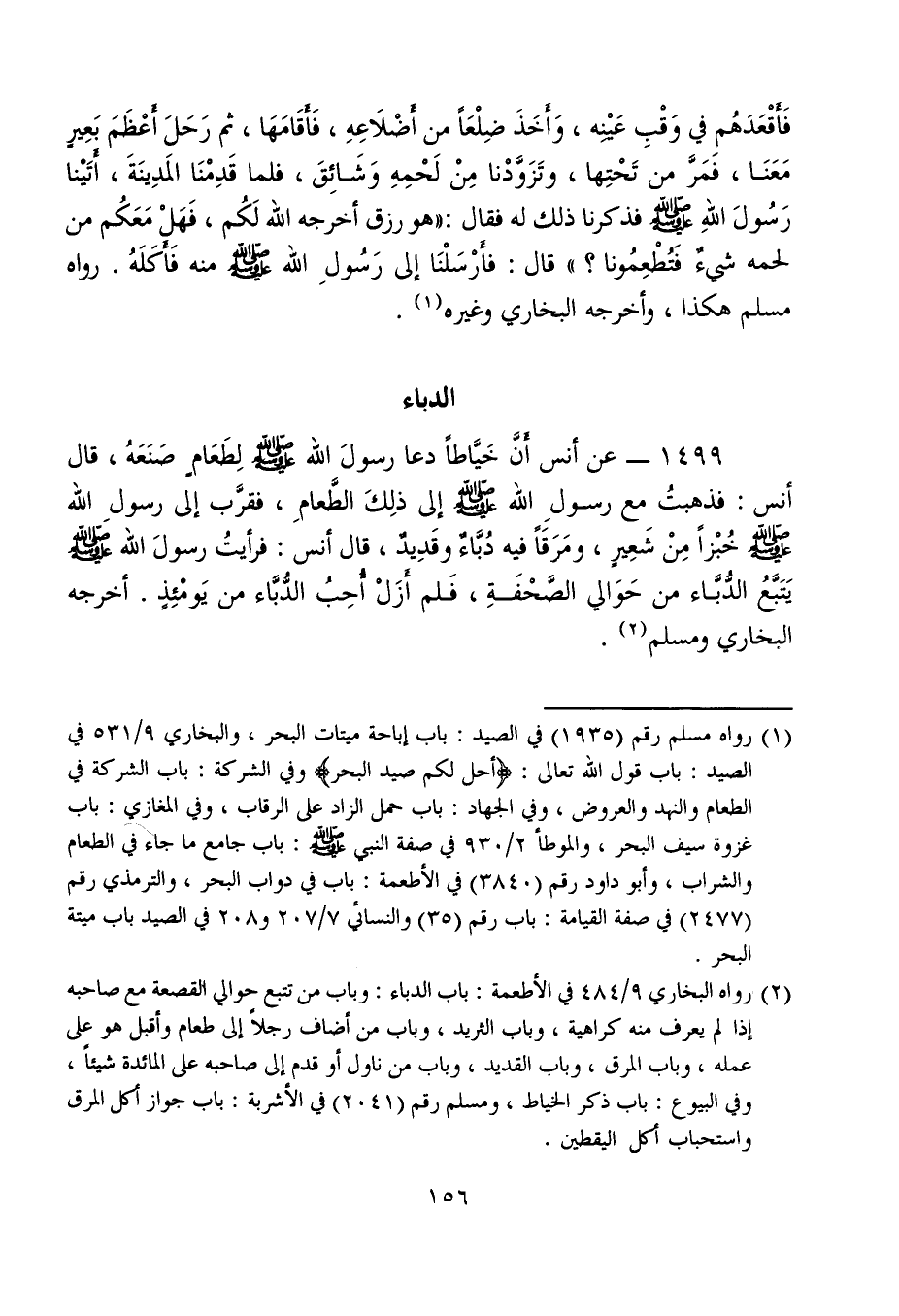 1499 - عن أنس أَنَّ خَيَّاطًا دعا رسولَ الله - صلى الله عليه وسلم - لِطَعَامٍ صَنَعَهُ، قال أنس: فذهبتُ مع رسولِ الله - صلى الله عليه وسلم - إلى ذلِكَ الطَّعامِ، فقرَّب إلى رسول الله - صلى الله عليه وسلم - خُبْزًا مِنْ شَعِيرٍ، ومَرَقًا فيه دُبَّاءٌ وقَدِيدٌ، قال أنس: فرأيتُ رسولَ الله - صلى الله عليه وسلم - يَتَبَّعُ الدُّبَّاء من حَوَالي الصَّحْفَةِ، فَلم أزَلْ أُحِبُ الدُّبَّاء من يَومْئِذٍ. أخرجه البخاري ومسلم (¬2).