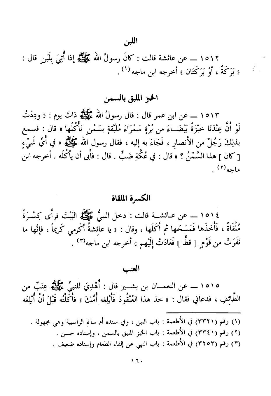 1514 - عن عائشة قالت: دخل النبيُّ - صلى الله عليه وسلم - البَيْتَ فرأَى كِسْرَةً مُلْقَاةً، فَأخَذَها فَمَسَحَها ثم أَكَلَها، وقال: "يا عائِشةُ أكْرمي كَريمًا، فإِنَّها ما نَفَرَتْ من قَوْمٍ [قطُّ] فَعَادَتْ إِلَيْهم" أخرجه ابن ماجه (¬3).
