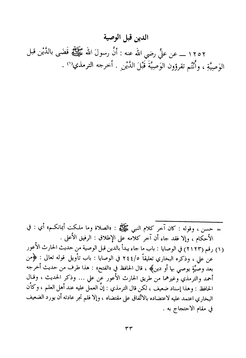 1252 - عن عليٍّ رضي الله عنه: أنَّ رسولَ الله - صلى الله عليه وسلم - قَضى بالدَّيْن قبل الوَصِيَّةِ، وأَنْتُم تقرؤون الوَصِيَّةَ قَبْلَ الدَّيْنِ. أخرجه الترمذي (¬1).