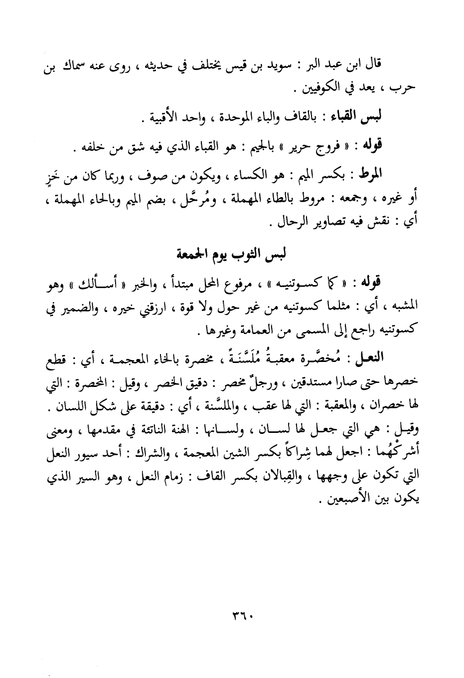 النعل: مُخصَّرة معقبةُ مُلَسَّنَةً، مخصرة بالخاء المعجمة، أي: قطع خصرها حتى صارا مستدقين، ورجلٌ مخصر: دقيق الخصر، وقيل: المخصرة: التي لها خصران، والمعقبة: التي لها عقب، والملسَّنة، أي: دقيقة على شكل اللسان. وقيل: هي التي جعل لها لسان، ولسانها: الهنة الناتئة في مقدمها، ومعنى أشركْهُما: اجعل لهما شِراكًا بكسر الشين المعجمة، والشراك: أحد سيور النعل التي تكون على وجهها، والقِبالان بكسر القاف: زمام النعل، وهو السير الذي يكون بين الأصبعين.