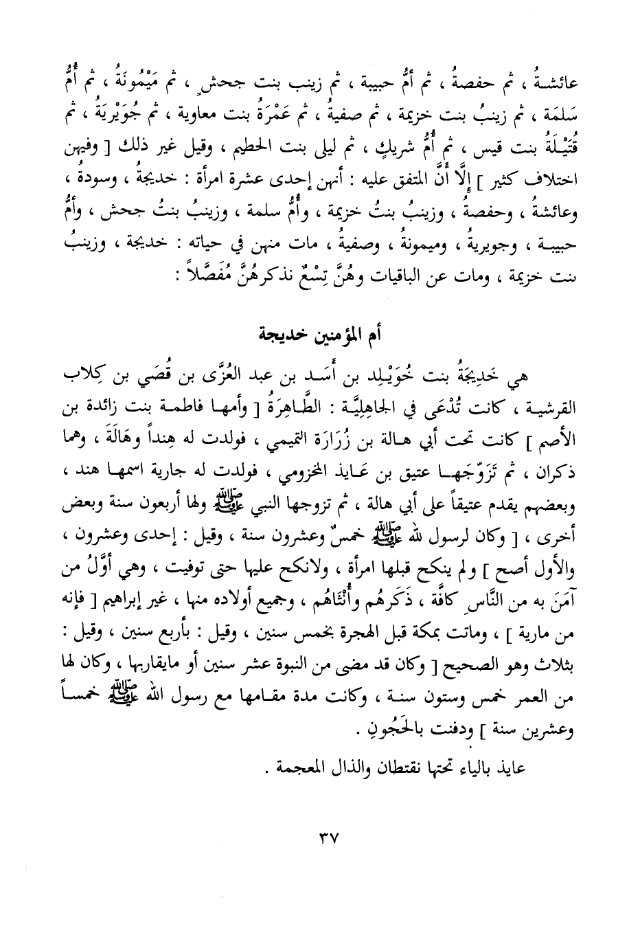 هي خَدِيجَةُ بنت خُوَيْلِد بن أَسَد بن عبد العُزَّى بن قُصَي بن كِلاب القرشية، كانت تُدْعَى في الجاهِلِيَّة: الطَّاهِرَةُ [وأمها فاطمة بنت زائدة بن الأصم] كانت تحت أبي هالة بن زُرَارَة التميمي، فولدت له هِندًا وهَالَةَ، وهما ذكران، ثم تَزَوّجَها عتيق بن عَايذ المخزومي، فولدت له جارية اسمها هند، وبعضهم يقدم عتيقًا على أبي هالة، ثم تزوجها النبي - صلى الله عليه وسلم - ولها أربعون سنة وبعض أخرى، [وكان لرسول لله - صلى الله عليه وسلم - خمسٌ وعشرون سنة، وقيل: إحدى وعشرون، والأول أصح] ولم ينكح قبلها امرأة، ولا نكح عليها حتى توفيت، وهي أوَّلُ من آمَنَ به من النَّاسِ كافَّة، ذَكَرهُم وأُنْثَاهُم، وجميع أولاده منها، غير إبراهيم [فإنه من مارية]، وماتت بمكة قبل الهجرة بخمس سنين، وقيل: بأربع سنين، وقيل: بثلاث وهو الصحيح [وكان قد مضى من النبوة عشر سنين أو ما يقاربها، وكان لها من العمر خمس وستون سنة، وكانت مدة مقامها مع رسول الله - صلى الله عليه وسلم - خمسًا وعشرين سنة] ودفنت بالحَجُونِ.