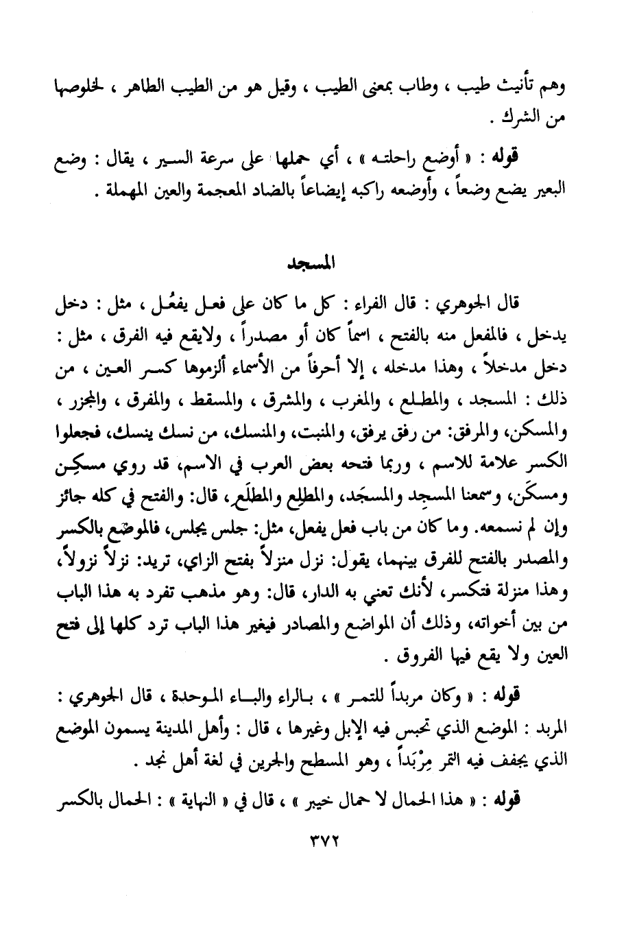 قال الجوهري: قال الفراء: كل ما كان على فعل يفعُل، مثل: دخل يدخل، فالمفعل منه بالفتح، اسمًا كان أو مصدرًا، ولا يقع فيه الفرق، مثل: دخل مدخلًا، وهذا مدخله، إلا أحرفًا من الأسماء ألزموها كسر العين، من ذلك: المسجد، والمطلع، والمغرب، والمشرق، والمسقط، والمفرق، والمجزر، والمسكن، والمرفق: من رفق يرفق، والمنبت، والمنسك، من نسك ينسك، فجعلوا الكسر علامة للاسم، وربما فتحه بعض العرب في الاسم، قد روي مسكِن ومسكَن، وسمعنا المسجِد والمسجَد، والمطلِع والمطلَعِ، قال: والفتح في كله جائز وإن لم نسمعه. وما كان من باب فعل يفعل، مثل: جلس يجلس، فالموضع بالكسر والمصدر بالفتح للفرق بينهما، يقول: نزل منزلًا بفتح الزاي، تريد: نزلًا نزولًا، وهذا منزلة فتكسر، لأنك تعني به الدار، قال: وهو مذهب تفرد به هذا الباب من بين أخواته، وذلك أن المواضع والمصادر فيغير هذا الباب ترد كلها إلى فتح العين ولا يقع فيها الفروق.