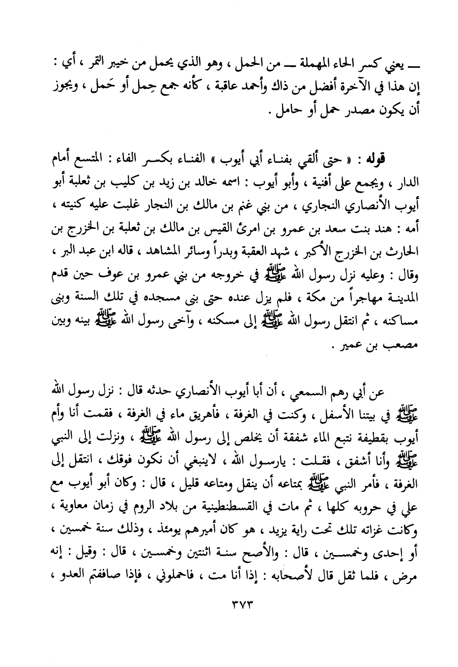 عن أبي رهم السمعي، أن أبا أيوب الأنصاري حدثه قال: نزل رسول الله - صلى الله عليه وسلم - في بيتنا الأسفل، وكنت في الغرفة، فأهريق ماء في الغرفة، فقمت أنا وأم أيوب بقطيفة نتبع الماء شفقة أن يخلص إلى رسول الله - صلى الله عليه وسلم -، ونزلت إلى النبي - صلى الله عليه وسلم - وأنا أشفق، فقلت: يا رسول الله، لا ينبغي أن نكون فوقك، انتقل إلى الغرفة، فأمر النبي - صلى الله عليه وسلم - بمتاعه أن ينقل ومتاعه قليل، قال: وكان أبو أيوب مع علي في حروبه كلها، ثم مات في القسطنطينية من بلاد الروم في زمان معاوية، وكانت غزاته تلك تحت راية يزيد، هو كان أميرهم يومئذ، وذلك سنة خمسين، أو إحدى وخمسين، قال: والأصح سنة اثنتين وخمسين، قال: وقيل: إنه مرض، فلما ثقل قال لأصحابه: إذا أنا مت، فاحملوني، فإذا صاففتم العدو،