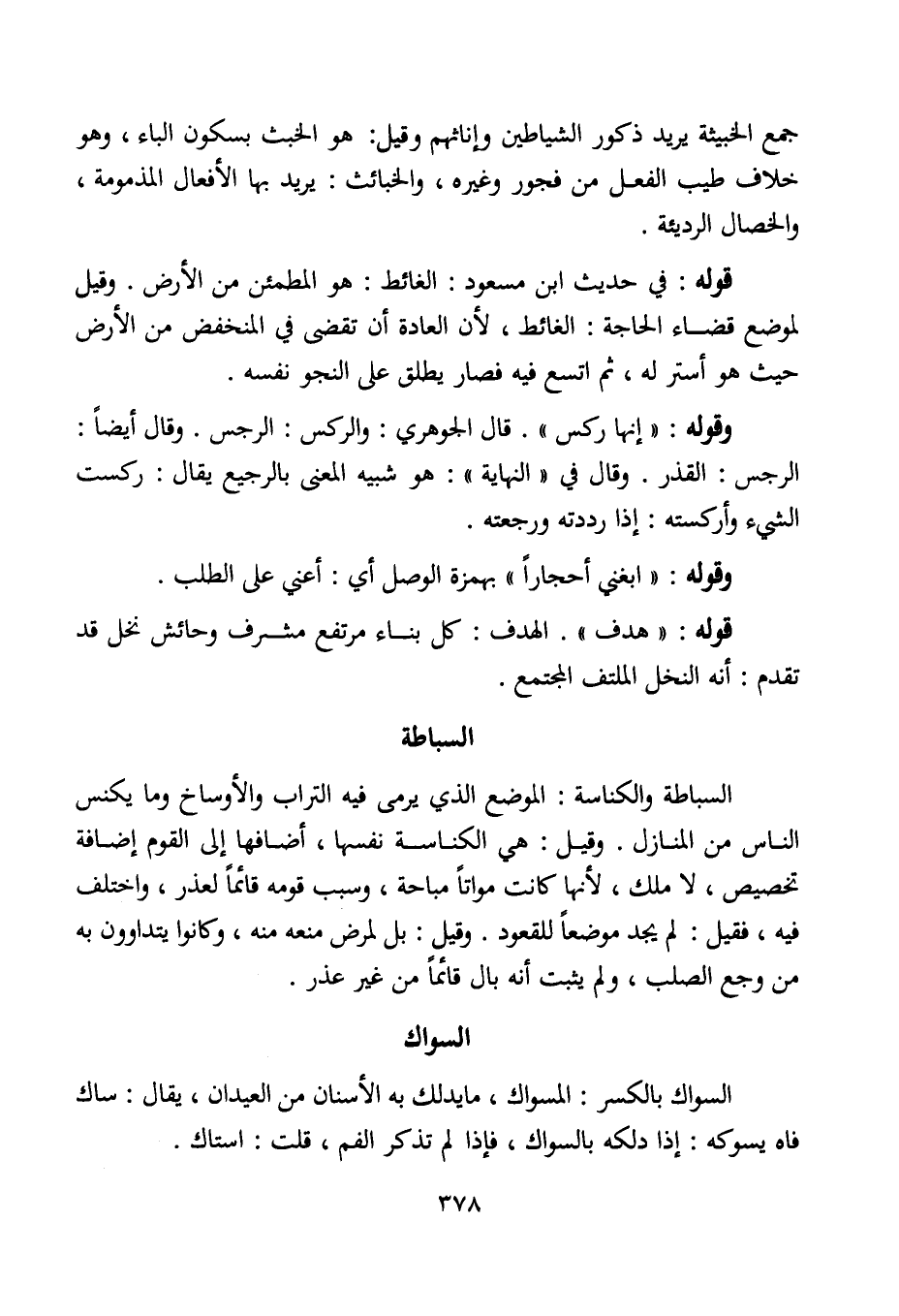 السباطة والكناسة: الموضع الذي يرمى فيه التراب والأوساخ وما يكنس الناس من المنازل. وقيل: هي الكناسة نفسها، أضافها إلى القوم إضافة تخصيص، لا ملك، لأنها كانت مواتًا مباحة، وسبب قومه قائمًا لعذر، واختلف فيه، فقيل: لم يجد موضعًا للقعود. وقيل: بل لمرض منعه منه، وكانوا يتداوون به من وجع الصلب، ولم يثبت أنه بال قائمًا من غير عذر.