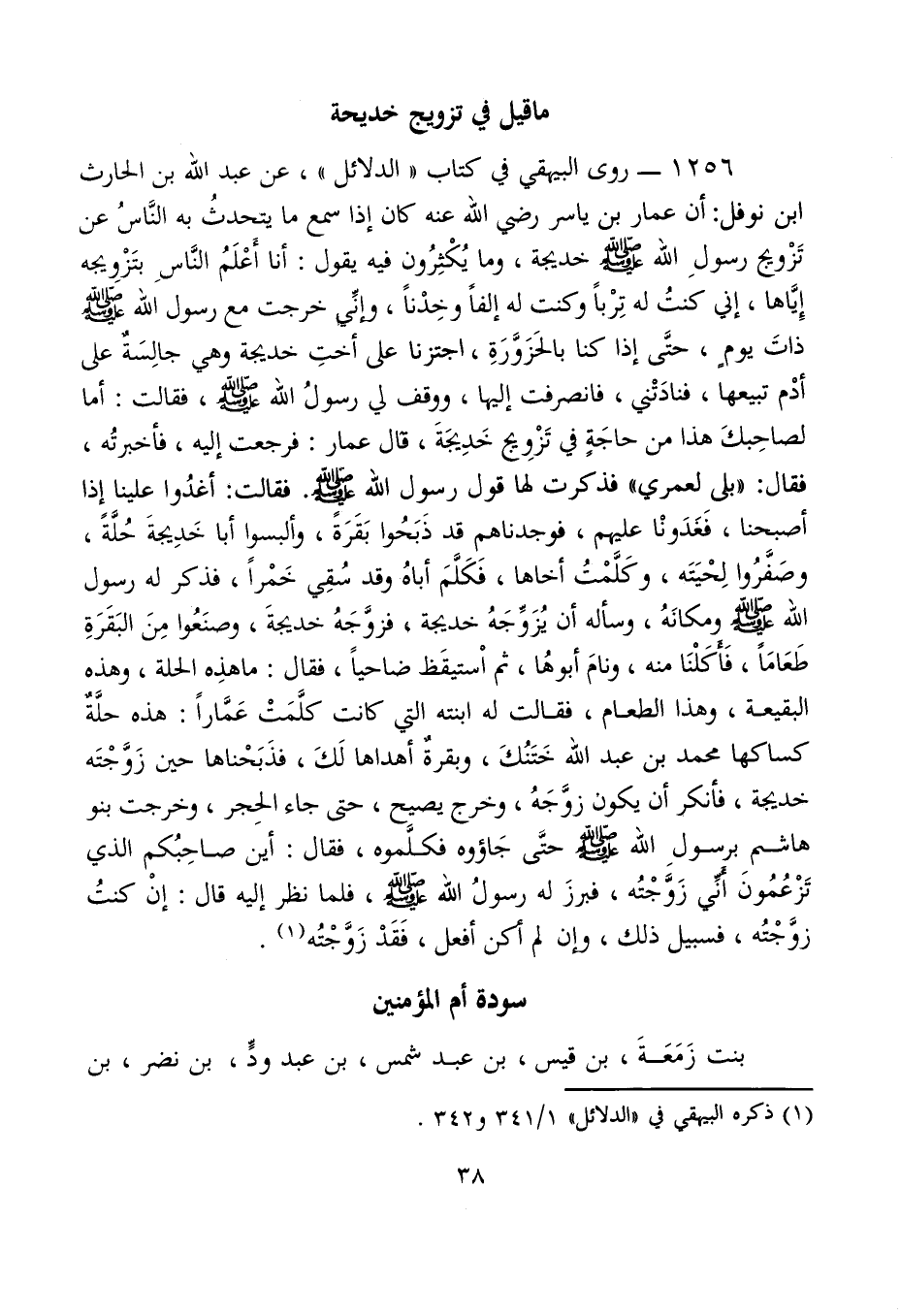 1256 - روى البيهقي في كتاب "الدلائل"، عن عبد الله بن الحارث بن نوفل: أن عمار بن ياسر رضي الله عنه كان إذا سمع ما يتحدثُ به النَّاسُ عن تَزْويج رسولِ الله - صلى الله عليه وسلم - خديجة، وما يُكْثِرُون فيه يقول: أنا أَعْلَمُ النَّاسِ بتَزْوِيجه إيَّاها، إنِّي كنتُ له تِرْبًا وكنت له إلفًا وخِدْنًا، وإنِّي خرجت مع رسول الله - صلى الله عليه وسلم - ذاتَ يومٍ، حتَّى إذا كنا بالحَزَوَّرَةِ، اجتزنا على أختِ خديجة وهي جالِسَةٌ على أدْم تبيعها، فنادَتْني، فانصرفت إليها، ووقف لي رسولُ الله - صلى الله عليه وسلم -، فقالت: أما لصاحِبكَ هذا من حاجَةٍ في تَزْوِيج خَدِيجَةَ، قال عمار: فرجعت إليه، فأخبرتُه، فقال: "بلى لعمري" فذكرت لها قول رسول الله - صلى الله عليه وسلم -. فقالت: أغدُوا علينا إذا أصبحنا، فَغَدَونا عليهم، فوجدناهم قد ذَبَحُوا بَقَرَةً، وألبسوا أبا خَدِيجةَ حُلَّةً، وصَفَّرُوا لِحْيَتَه، وكَلَّمْتُ أخاها، فَكَلَّمَ أباهُ وقد سُقِي خَمْرًا، فذكر له رسول الله - صلى الله عليه وسلم - ومكانَهُ، وسأله أن يُزَوِّجَهُ خديجة، فزوَّجَهُ خديجةَ، وصنَعُوا مِنَ البَقَرَةِ طَعَامًا، فَأَكَلْنَا منه، ونامَ أبوهُا، ثم استيقَظ ضاحيًا، فقال: ما هذِه الحلة، وهذه البقيعة، وهذا الطعام، فقالت له ابنته التي كانت كلَّمَتْ عَمَّارًا: هذه حلَّةٌ كساكها محمد بن عبد الله خَتَنُكَ، وبقرةٌ أهداها لَكَ، فذَبَحْناها حين زَوَّجْتَه خديجة، فأنكر أن يكون زوَّجَهُ، وخرج يصيح، حتى جاء الحِجر، وخرجت بنو هاشم برسول الله - صلى الله عليه وسلم - حتَّى جَاؤوه فكلَّموه، فقال: أين صاحِبُكم الذي تَزْعُمُونَ أَنِّي زَوَّجْتُه، فبرزَ له رسولُ الله - صلى الله عليه وسلم -، فلما نظر إليه قال: إنْ كنتُ زوَّجْتُه، فسبيل ذلك، وإن لم أكن أفعل، فَقَدْ زَوَّجْتُه (¬1).