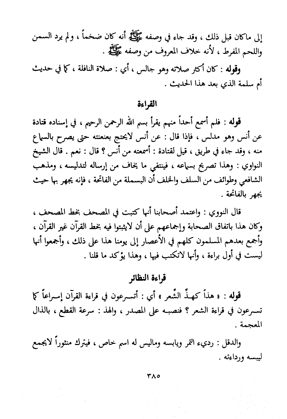 قوله: فلم أسمع أحدًا منهم يقرأ بِسْمِ اللَّهِ الرَّحْمَنِ الرَّحِيمِ، في إسناده قتادة عن أنس وهو مدلس، فإذا قال: عن أنس لا يحتج بعنعنته حتى يصرح بالسماع منه، وقد جاء في طريق، قيل لقتادة: أسمعته من أنس؟ قال: نعم. قال الشيخ النواوي: وهذا تصريح بسماعه، فينتقي ما يخاف من إرساله لتدليسه، ومذهب الشافعي وطوائف من السلف والخلف أن البسملة من الفاتحة، فإنه يجهر بها حيث يجهر بالفاتحة.