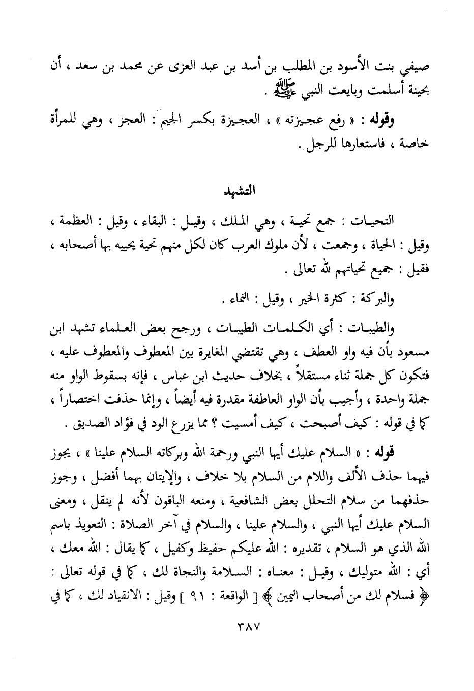 والطيبات: أي الكلمات الطيبات، ورجح بعض العلماء تشهد ابن مسعود بأن فيه واو العطف، وهي تقتضي المغايرة بين المعطوف والمعطوف عليه، فتكون كل جملة ثناء مستقلًا، بخلاف حديث ابن عباس، فإنه بسقوط الواو منه جملة واحدة، وأجيب بأن الواو العاطفة مقدرة فيه أيضًا، وإنما حذفت اختصارًا، كما في قوله: كيف أصبحت، كيف أمسيت؟ مما يزرع الود في فؤاد الصديق.
