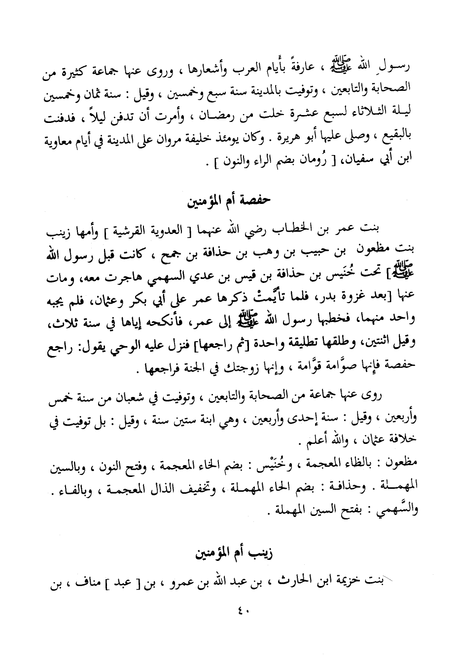 رسولِ الله - صلى الله عليه وسلم -، عارفةً بأَيام العرب وأشعارها، وروى عنها جماعة كثيرة من الصحابة والتابعين، وتوفيت بالمدينة سنة سبع وخمسين، وقيل: سنة ثمان وخمسين ليلة الثلاثاء لسبع عشرة خلت من رمضان، وأمرت أن تدفن ليلًا، فدفنت بالبقيع، وصلى عليها أبو هريرة. وكان يومئذٍ خليفة مروان على المدينة في أيام معاوية بن أبي سفيان، [رُومان بضم الراء والنون].