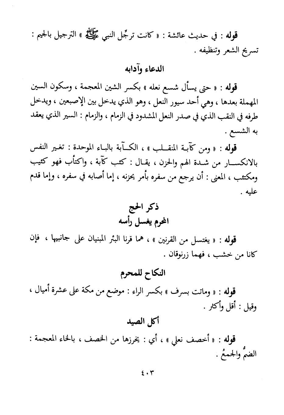 قوله: في حديث عائشة: "كانت ترجِّل النبي - صلى الله عليه وسلم -" الترجيل بالجيم: تسريح الشعر وتنظيفه.