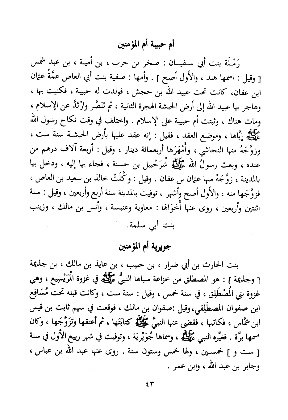 رَمْلَة بنت أبي سفيان: صخر بن حرب، بن أمية، بن عبد شمس [وقيل: اسمها هند، والأول أصح]. وأمها: صفية بنت أبي العاص عمَّةُ عثمان بن عفان، كانت تحت عبيد الله بن جحش، فولدت له حبيبة، فكنيت بها، وهاجر بها عبيد الله إلى أرض الحبشة الهجرة الثانية، ثم تَنَصَّر وارْتَدَّ عن الإسلام، ومات هناك، وثبتت أم حبيبة على الإسلام. واختلف في وقت نكاح رسول الله - صلى الله عليه وسلم - إيَّاها، وموضع العقد، فقيل: إنه عقد عليها بأرض الحبشة سنة ست، وزوَّجَهُ منها النجاشي، وأَمْهَرَها أربعمائة دينار، وقيل: أربعة آلاف درهم من عنده، وبعث رسولُ الله - صلى الله عليه وسلم - شُرَحْبيل بن حسنة، فجاء بها إليه، ودخل بها بالمدينة، زوَّجَهُ منها عثمان بن عفان. وقيل: وكَّلَتْ خالدَ بن سعيد بن العاص، فزوَّجَها منه، والأول أصح وأشهر، توفيت بالمدينة سنة أربع وأربعين، وقيل: سنة اثنتين وأربعين، روى عنها أَخَوَاهَا: معاوية وعنبسة، وأنس بن مالك، وزينب بنت أبي سلمة.