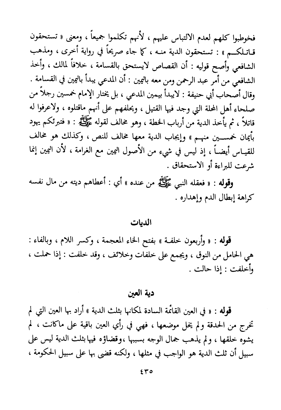 فخوطبوا كلهم لعدم الالتباس عليهم، لأنهم تكلموا جميعًا، ومعنى "تستحقون قاتلكم": تستحقون الدية منه، كما جاء صريحًا في رواية أخرى، ومذهب الشافعي وأصح قوليه: أن القصاص لا يستحق بالقسامة، خلافًا لمالك، وأخذ الشافعي من أمر عبد الرحمن ومن معه باليمين: أن المدعي يبدأ باليمين في القسامة. وقال أصحاب أبي حنيفة: لا يبدأ بيمين المدعي، بل يختار الإمام خمسين رجلًا من صلحاء أهل المحلة التي وجد فيها القتيل، ويحلفهم على أنهم ما قتلوه، ولا عرفوا له قاتلًا، ثم يأخذ الدية من أرباب الخطة، وهو مخالف لقوله - صلى الله عليه وسلم -: "فتبرئكم يهود بأيمان خمسين منهم" وإيجاب الدية معها مخالف للنص، وكذلك هو مخالف للقياس أيضًا، إذ ليس في شيء من الأصول اليمين مع الغرامة، لأن اليمين إنما شرعت للبراءة أو الاستحقاق.