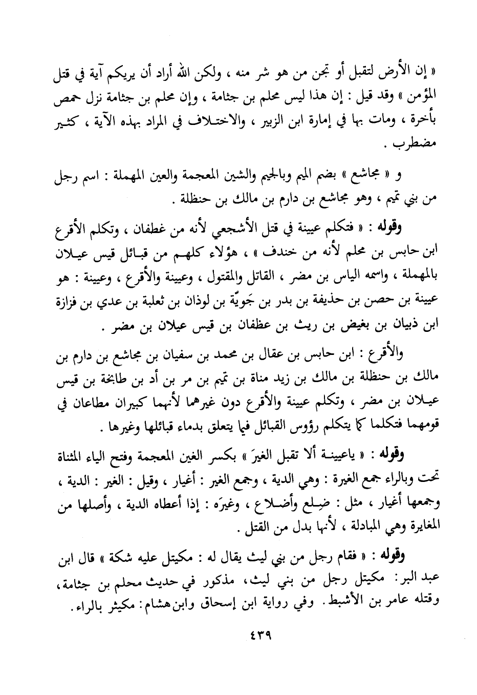 وقوله: "فتكلم عيينة في قتل الأشجعي لأنه من غطفان، وتكلم الأقرع بن حابس بن محلم لأنه من خندف"، هؤلاء كلهم من قبائل قيس عيلان بالمهملة، واسمه الياس بن مضر، القاتل والمقتول، وعيينة والأقرع، وعيينة: هو عيينة بن حصن بن حذيفة بن بدر بن جَويّة بن لوذان بن ثعلبة بن عدي بن فزازة بن ذبيان بن بغيض بن ريث بن عظفان بن قيس عيلان بن مضر.