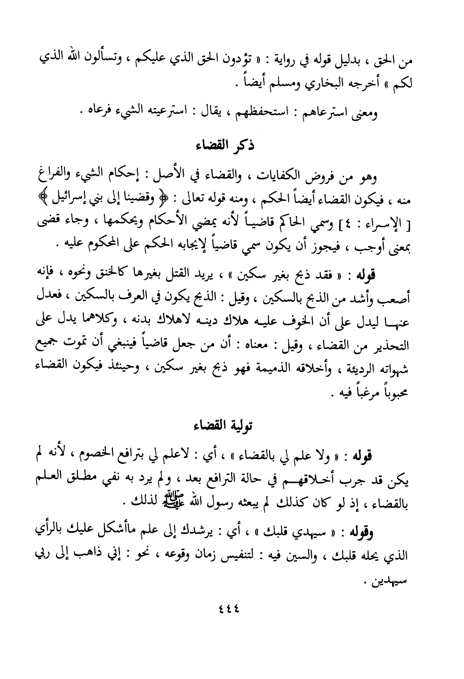 وهو من فروض الكفايات، والقضاء في الأصل: إحكام الشيء والفراغ منه، فيكون القضاء أيضًا الحكم، ومنه قوله تعالى: {وَقَضَيْنَا إِلَى بَنِي إِسْرَائِيلَ} [الإسراء: 4] وسمي الحاكم قاضيًا لأنه يمضي الأحكام ويحكمها، وجاء قضى بمعنى أوجب، فيجوز أن يكون سمي قاضيًا لإيجابه الحكم على المحكوم عليه.