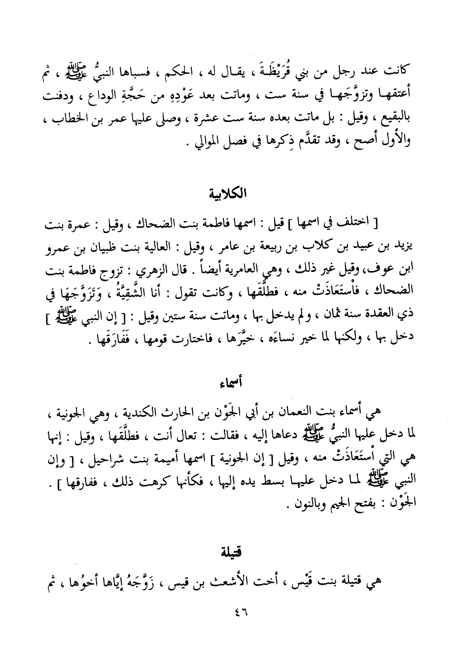 هي أسماء بنت النعمان بن أبي الجَوْن بن الحارث الكندية، وهي الجونية، لما دخل عليها النبيُّ - صلى الله عليه وسلم - دعاها إليه، فقالت: تعال أنت، فطلَّقَها، وقيل: إنها هي التي اسْتَعَاذَتْ منه، وقيل [إن الجونية] اسمها أميمة بنت شراحيل، [وإن النبي - صلى الله عليه وسلم - لما دخل عليها بسط يده إليها، فكأنها كرهت ذلك، ففارقها]. الجَوْن: بفتح الجيم وبالنون.