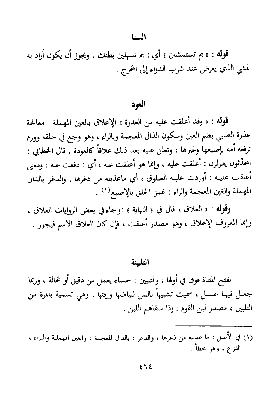 قوله: "وقد أعلقت عليه من العذرة" الإعلاق بالعين المهملة: معالجة عذرة الصبي بضم العين وسكون الذال المعجمة وبالراء، وهو وجع في حلقه وورم ترفعه أمه بإصبعها وغيرها، وتعلق عليه بعد ذلك علاقًا كالعوذة. قال الخطابي: المحدِّثون يقولون: أعلقت عليه، وإنما هو أعلقت عنه، أي: دفعت عنه، ومعنى أعلقت عليه: أوردت عليه العلوق، أي ما عذبته من دغرها. والدغر بالدال المهملة والغين المعجمة والراء: غمز الحلق بالإصبع (¬1).