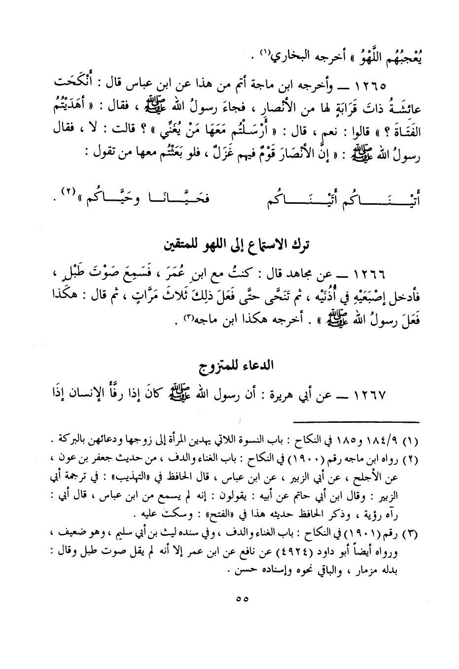 (¬2) رواه ابن ماجه رقم (1900) في النكاح: باب الغناء والدف، من حديث جعفر بن عون، عن الأجلح، عن أبي الزبير، عن ابن عباس، قال الحافظ في "التهذيب": في ترجمة أو الزبير: وقال ابن أبي حاتم عن أبيه: يقولون: إنه لم يسمع من ابن عباس، قال أبي: رآه رؤية، وذكر الحافظ حديثه هذا في "الفتح": وسكت عليه.