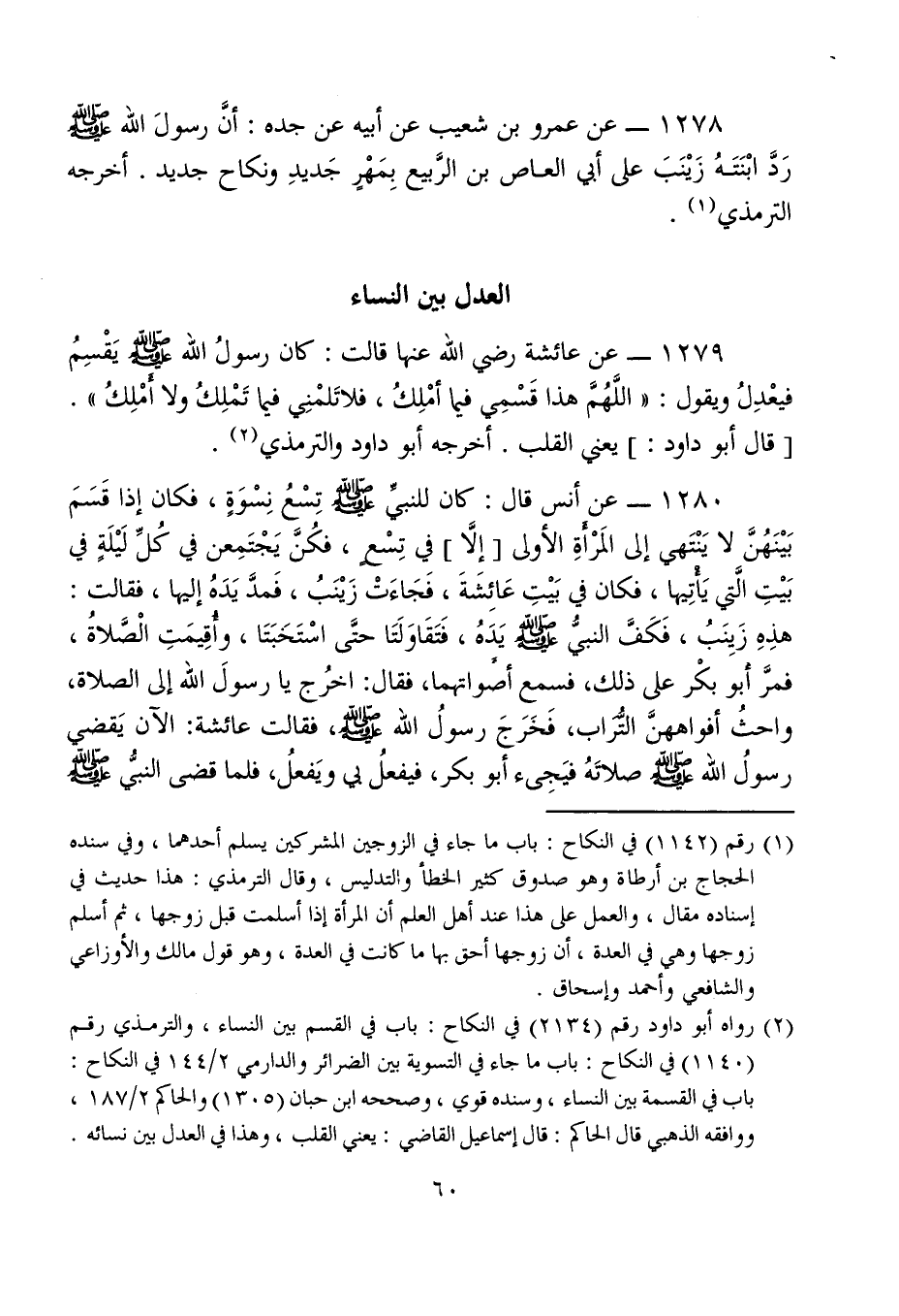 1278 - عن عمرو بن شعيب عن أبيه عن جده: أنَّ رسولَ الله - صلى الله عليه وسلم - رَدَّ ابْنَتَهُ زَيْنَبَ على أي العاص بن الرَّبيع بِمَهْرٍ جَديدِ ونكاح جديد. أخرجه الترمذي (¬1).