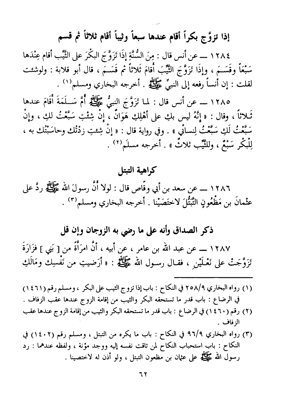 (¬2) رقم (1460) في الرضاع: باب قدر ما تستحقه البكر والثيب من إقامة الزوج عندها عقب الزفاف.