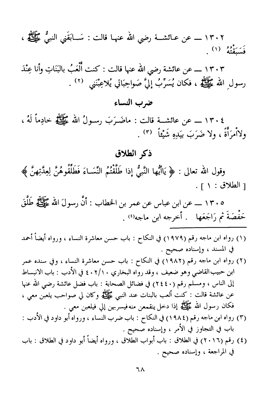 1304 - عن عائشة قالت: ما ضَرَبَ رسولُ الله - صلى الله عليه وسلم - خادِمًا لَهُ, ولا امْرَأَةً، ولا ضَرَبَ بيَدِهِ شَيْئًا (¬3).